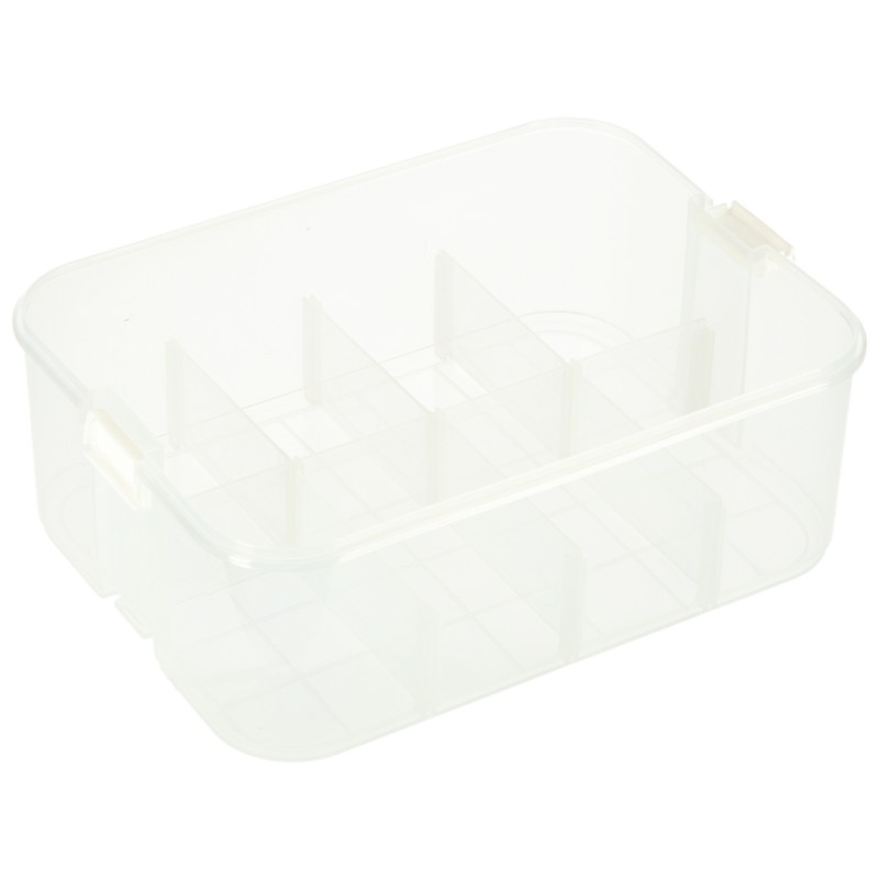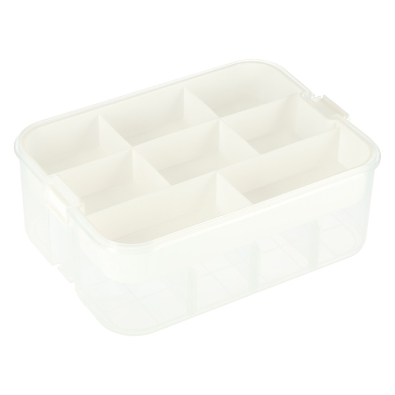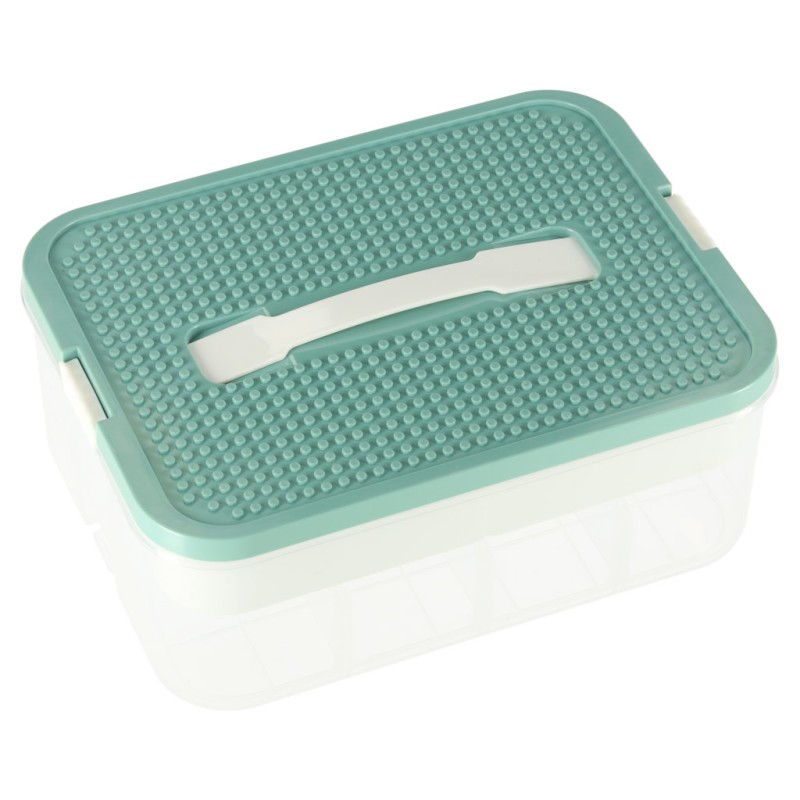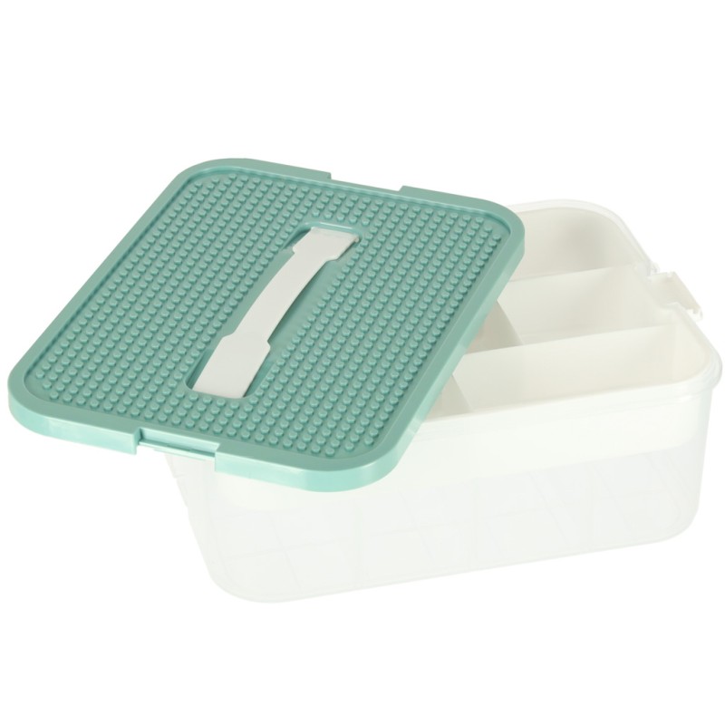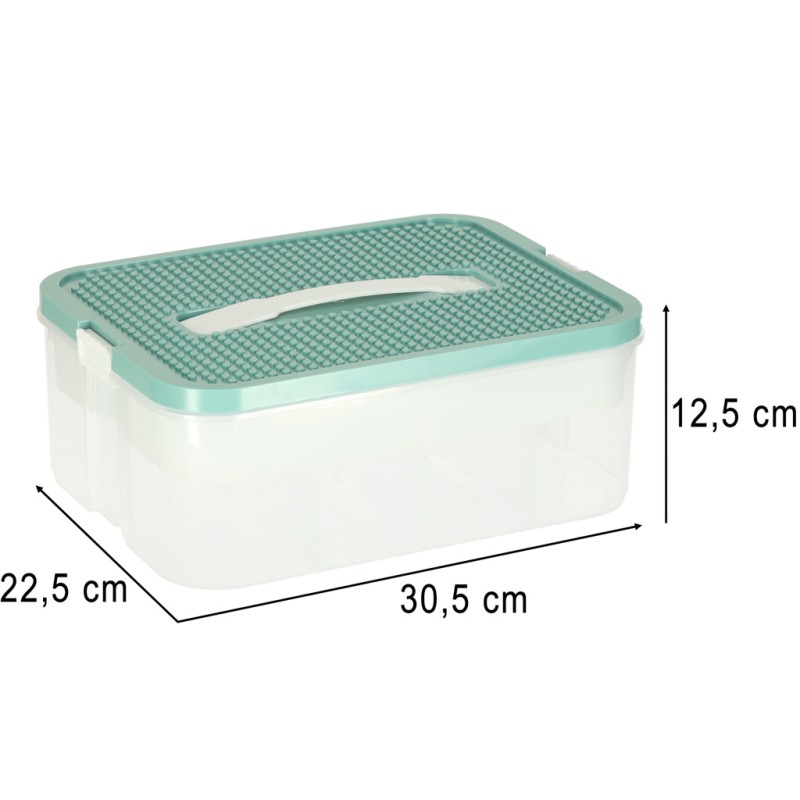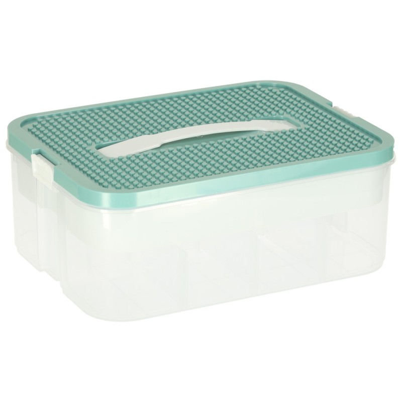 Parametry techniczne: • Materiał: plastik • Kolor:Pojemnik i wkład: Transparentny, biały Pokrywa: Turkusowa • Ilość poziomów: 1 • Zamknięcie: Solidne zatrzaski zabezpieczające zawartość • Uchwyt: Tak – wygodny do przenoszenia • Modyfikowanie przegródek: Tak – dzięki dołączonym wkładkom • Pojemność całkowita: 8 litrów