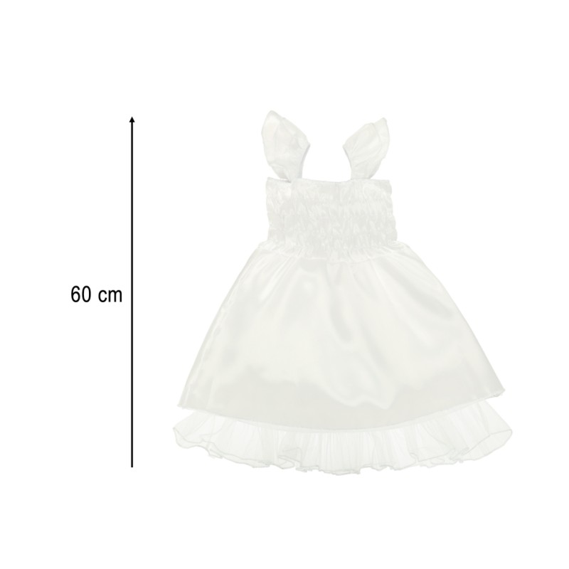 Zestaw zawiera krótką, białą sukienkę z tiulowym wykończenie, opaskę z aureolą i brokatowe skrzydła dodające stroju magicznego charakteru. Całość została wykonana z trwałego poliestru, który zapewnia komfort noszenia i swobodę ruchów podczas zabawy lub występów.