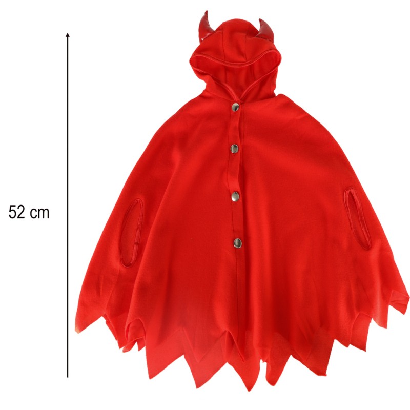 Czerwona peleryna jest wykonany z przyjemnego w dotyku materiału i jak tak uszyty, aby zapewnić swobodę ruchów, umożliwiając dziecku zabawę. Zapinana jest na cztery zatrzaski i ma kaptur z rogami. Rękawiczki mają puszek na brzegu, co stanowi interesujący akcent.