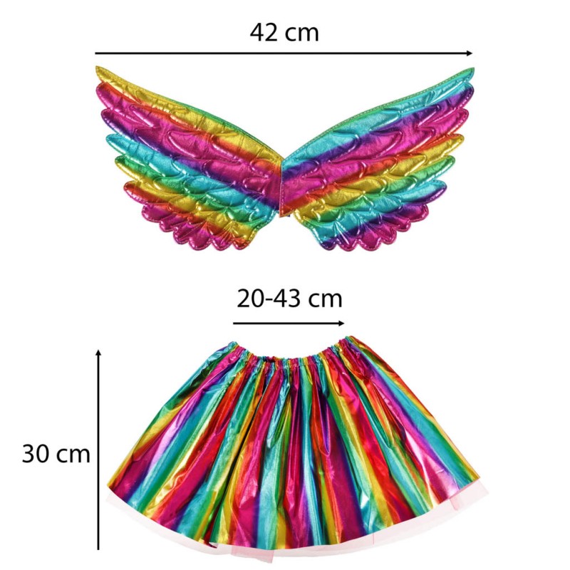 Tęczowy kostium jednorożca - idealny na bal przebierańców czy imprezę tematyczną. W zestawie tiulowa spódnica, opaska z rogiem i kolorowe skrzydła. Tworzywo: poliester. Długość spódnicy: 30 cm. Szerokość gumki: 2x 25-47 cm.