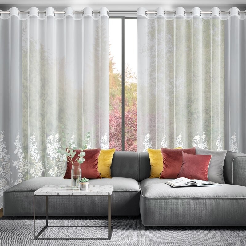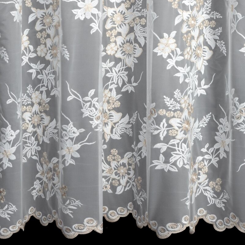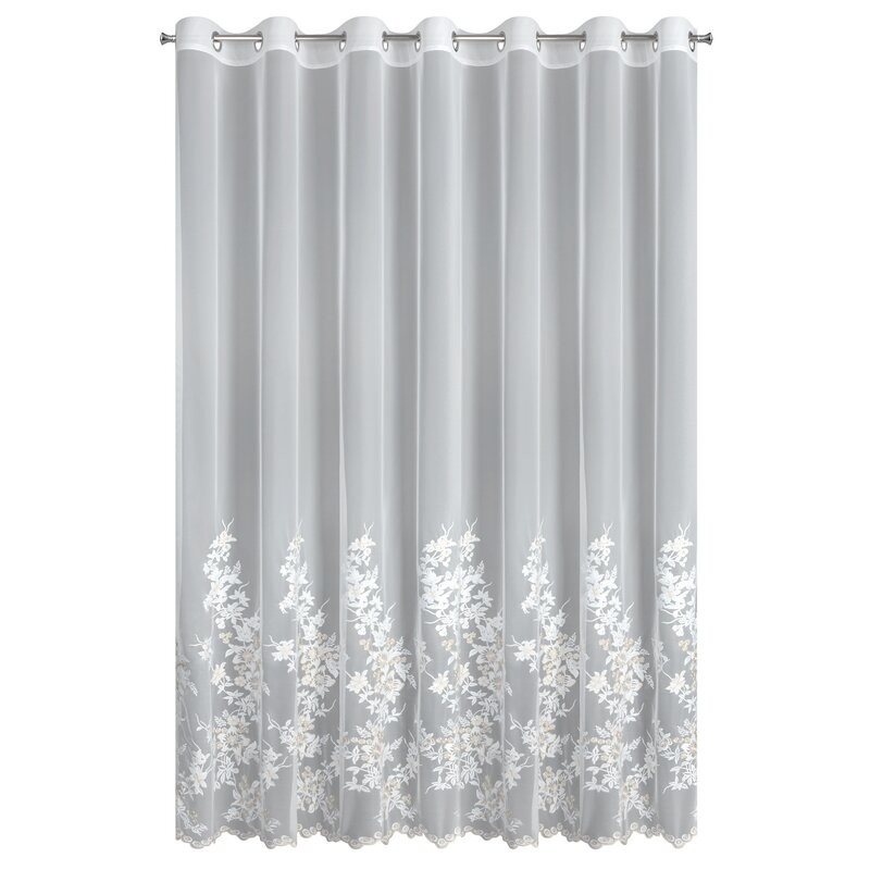 Firana wykonana z delikatnej, siateczkowej tkaniny zachwyca subtelnym haftem kwiatów, wzbogaconym o szampańską, lekko lśniącą nić. Jej dekoracyjny dół zakończony został finezyjną, haftowaną falą, która dodaje całej aranżacji lekkości i elegancji. Dzięki praktycznym przelotkom, firana układa się w idealne, miękkie fale i jest niezwykle łatwa w zawieszeniu na karniszu.