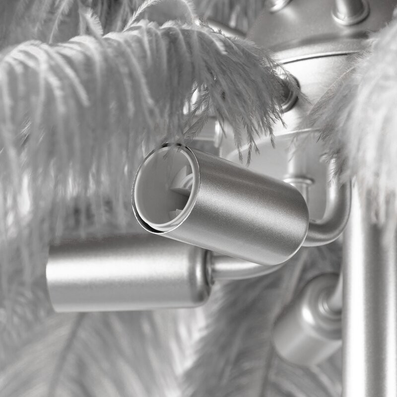 Lampa dekoracyjna, stojąca szerokość: 95 cm, długość: 95 cm, kolor: srebrny, Skład: lampa: metal; abażur: pióro , Zasilanie: CE 220-230V , Żarowka: 5 X E14 LED MAX 5W , Klasa energetyczna: A-G