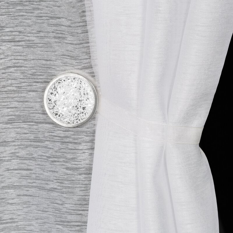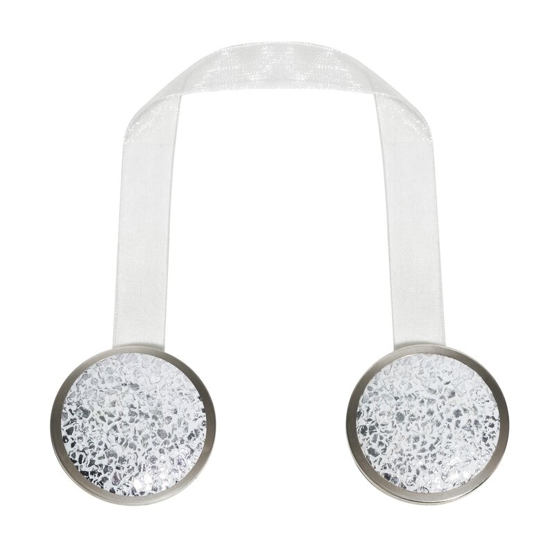 Komplet 2 szt. eleganckich magnesów dekoracyjnych to stylowy sposób na upięcie zasłon, firan lub lekkich tkanin. Połączone wstążka umożliwiają estetyczne i funkcjonalne upięcie materiału bez jego uszkadzania.