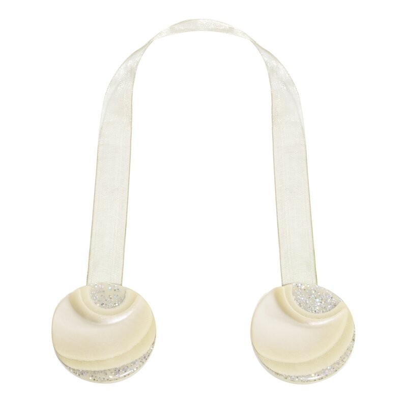 Komplet 2 szt. eleganckich magnesów dekoracyjnych to stylowy sposób na upięcie zasłon, firan lub lekkich tkanin. Połączone wstążka umożliwiają estetyczne i funkcjonalne upięcie materiału bez jego uszkadzania.