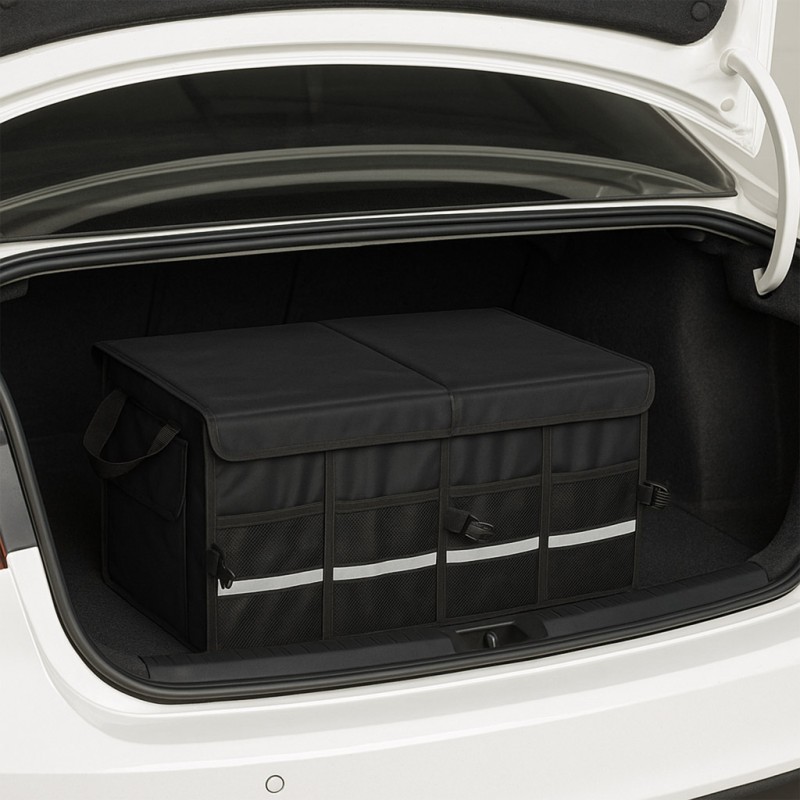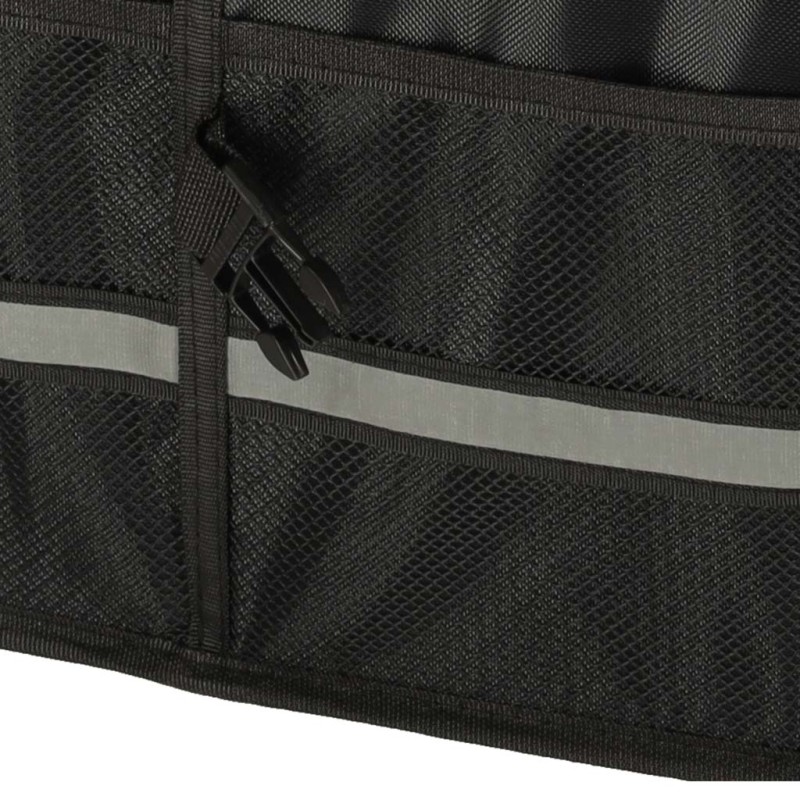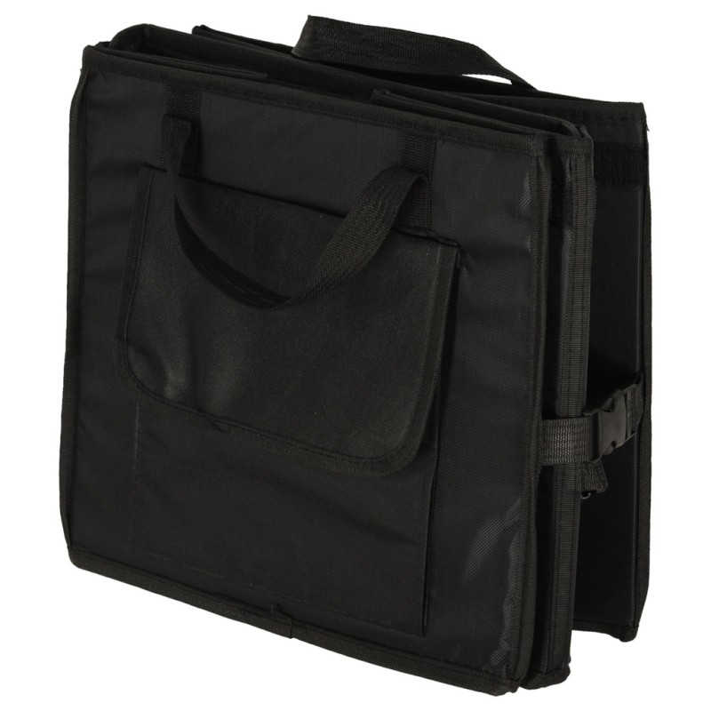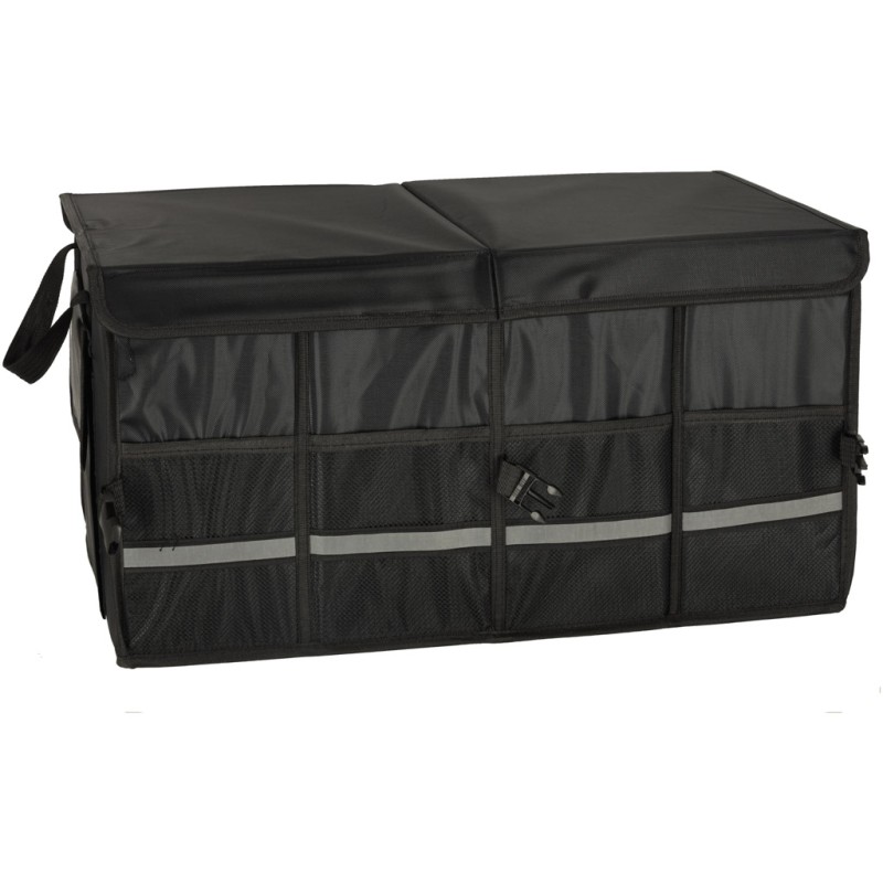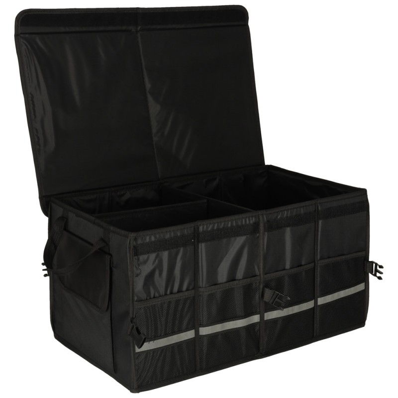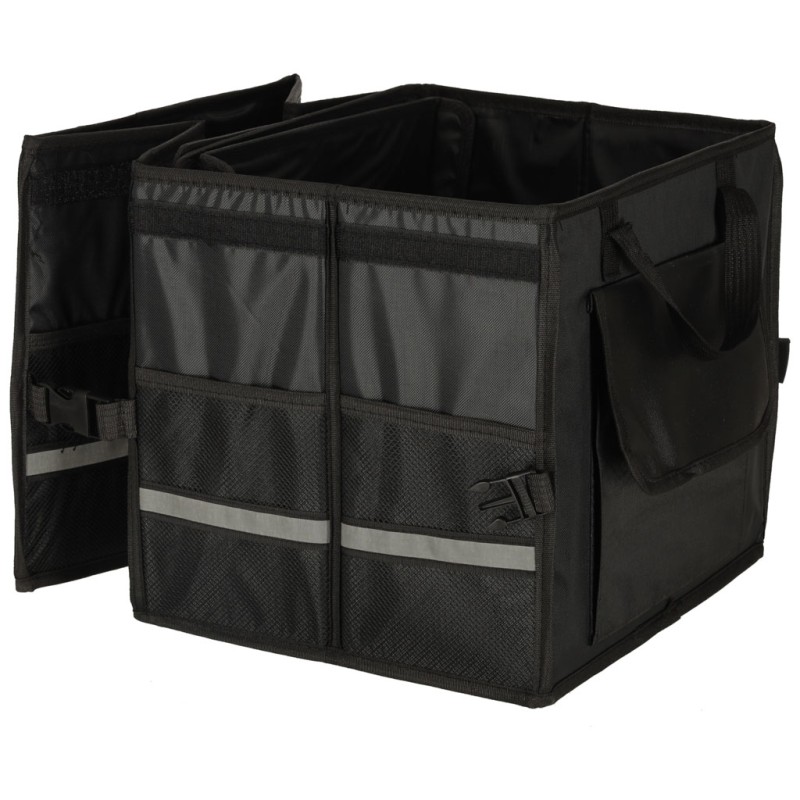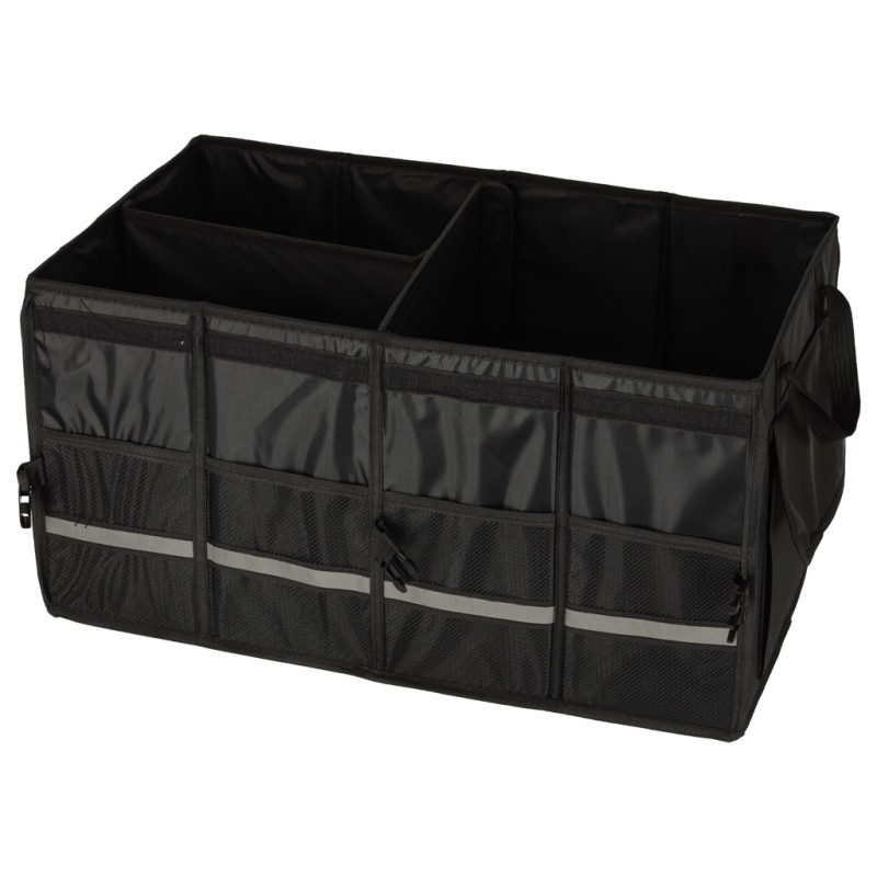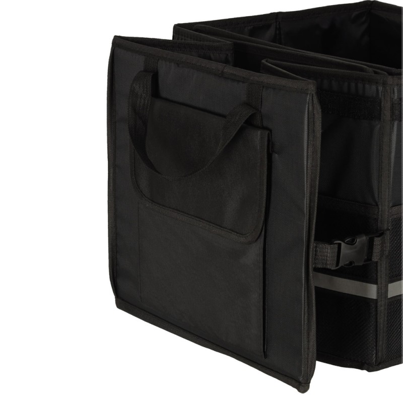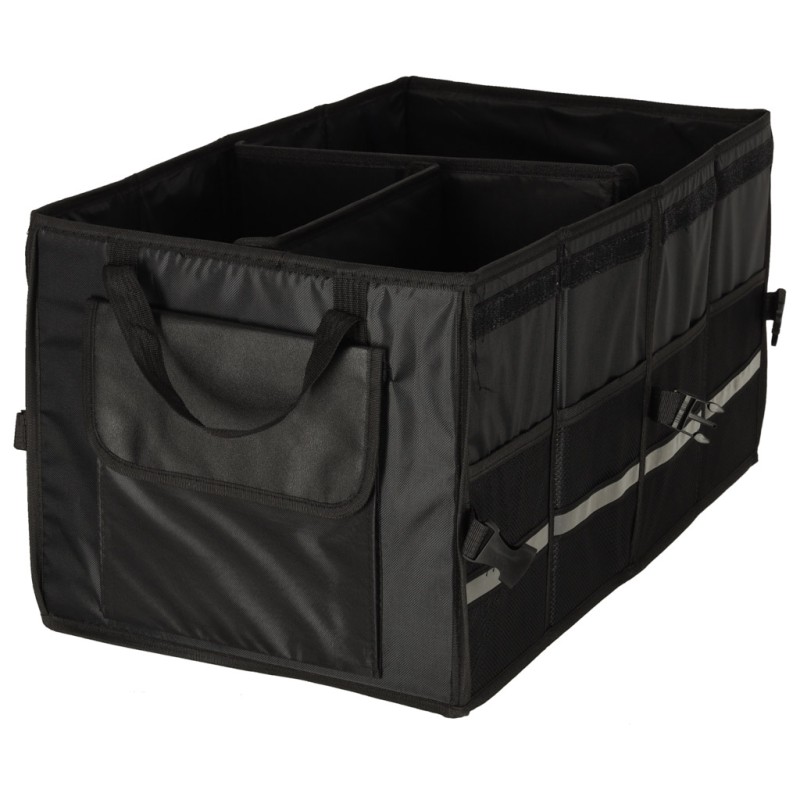 Organizer do bagażnika z odpinanymi przegródkami i klapą. Zmieści się w bagażniku dzięki odpinanym klamrom. Ma odblaskową taśmę, przez co torba jest widoczna w ciemności. Wymiary: 60 cm x 35 cm x 30 cm, kolor: czarny