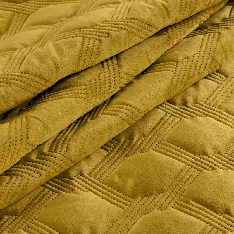 Klasyczna i bardzo elegancka narzuta na łóżko z miękkiego welwetu pikowana w modny motyw łuski. Pikowania wykonane metodą bezszwową hotpress. szerokość: 170 cm, długość: 210 cm, kolor: musztardowy, Gramatura: 180 GSM, Skład: 100% poliester