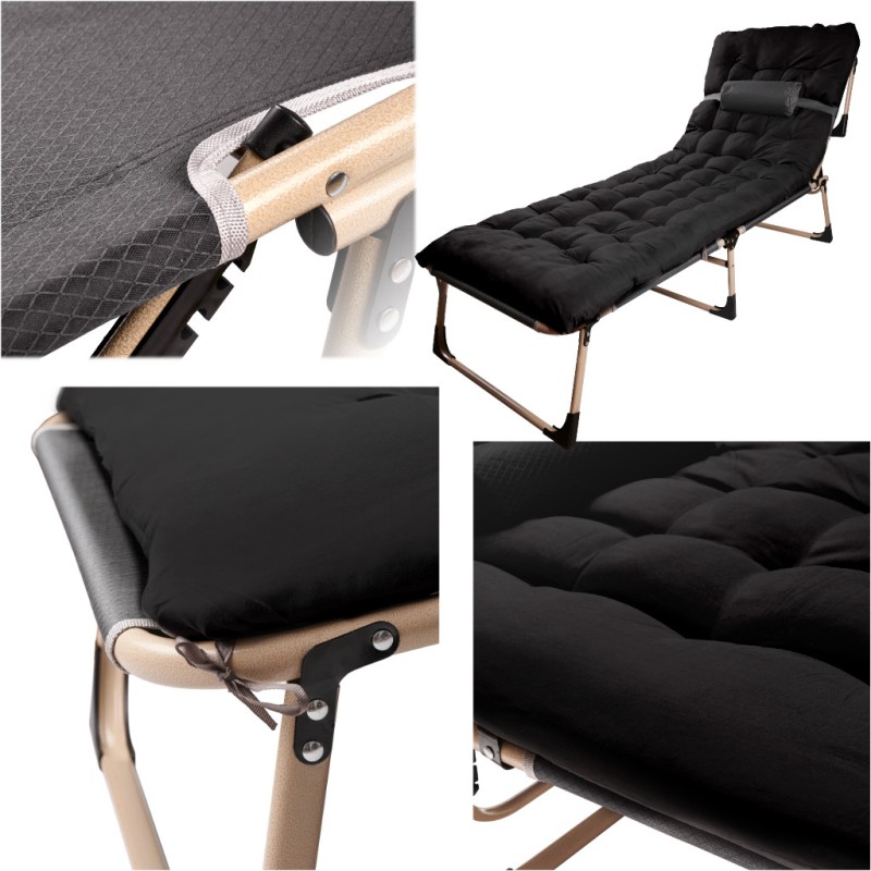 Turystyczne składane łóżko z 4-poziomową regulacją oparcia. Miękki materac i poduszka w zestawie zapewniają komfortowy sen i wypoczynek w pomieszczeniu oraz na zewnątrz. Wymiary łóżka: 193 cm x 66, kolor: czarny