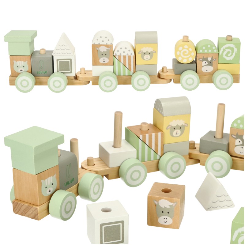 Ta kolejka zabierze Twoje dziecko w podróż pełną zabawy! Trzy wagony pełne drewniany klocków gwarantują godziny kreatywnej zabawy. Maluch może budować różne ciuchcie, które za każdym razem będą miały niepowtarzalny wygląd. Ale klocki doskonale sprawdzą się również jako samodzielna zabawka.