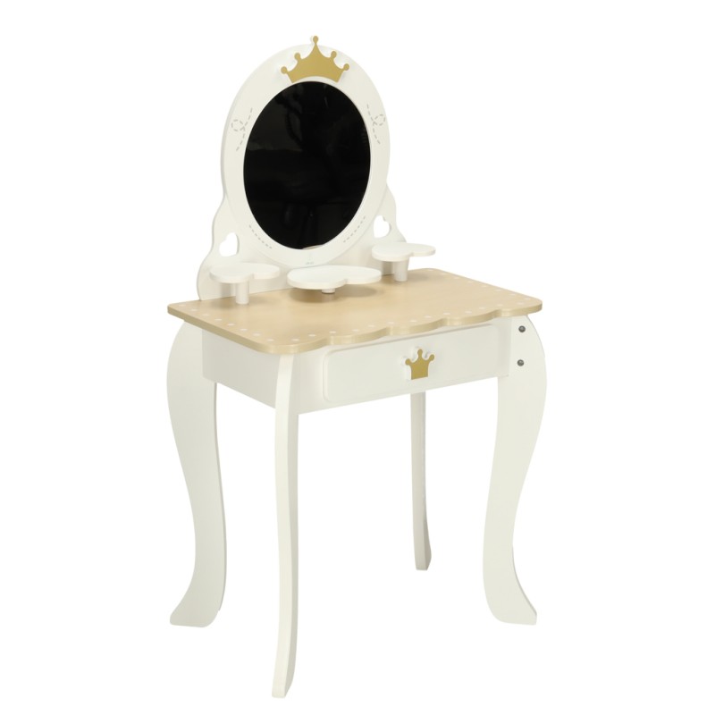 Toaletka wraz z akcesoriami jest wykonana w całości z drewna, którego zostało wyszlifowane na gładko i pomalowane nietoksycznymi farbami. Biało-złota kolorystyka sprawia, że zestaw jest minimalistyczny i doskonale sprawi się jako ozdoba pokoju dziecka.