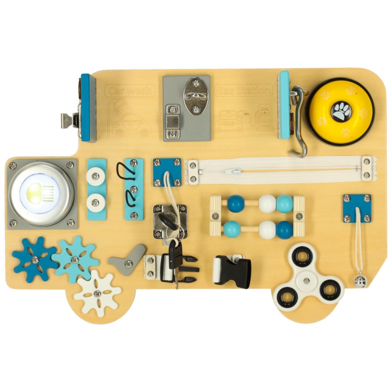 Ta tablica jest w kształcie autobusu, co z pewnością spodoba się każdemu miłośnikowi pojazdów. Elementy sensoryczne również nawiązują do motoryzacji – maluch znajdzie na tablicy drewniane autka, a także ukryte pod kolorowymi kwadratami rysunki stacji benzynowej i myjni samochodowej.