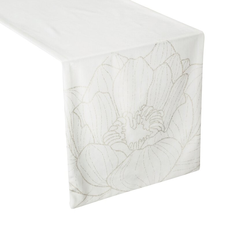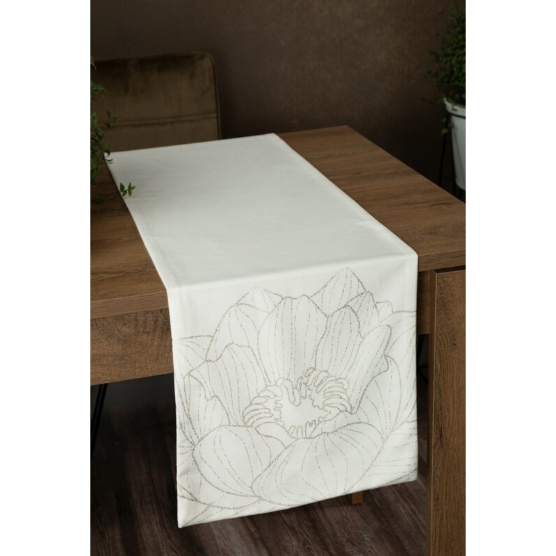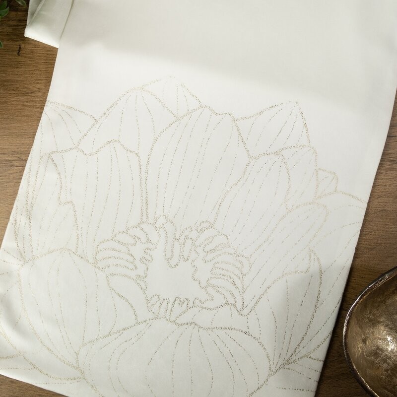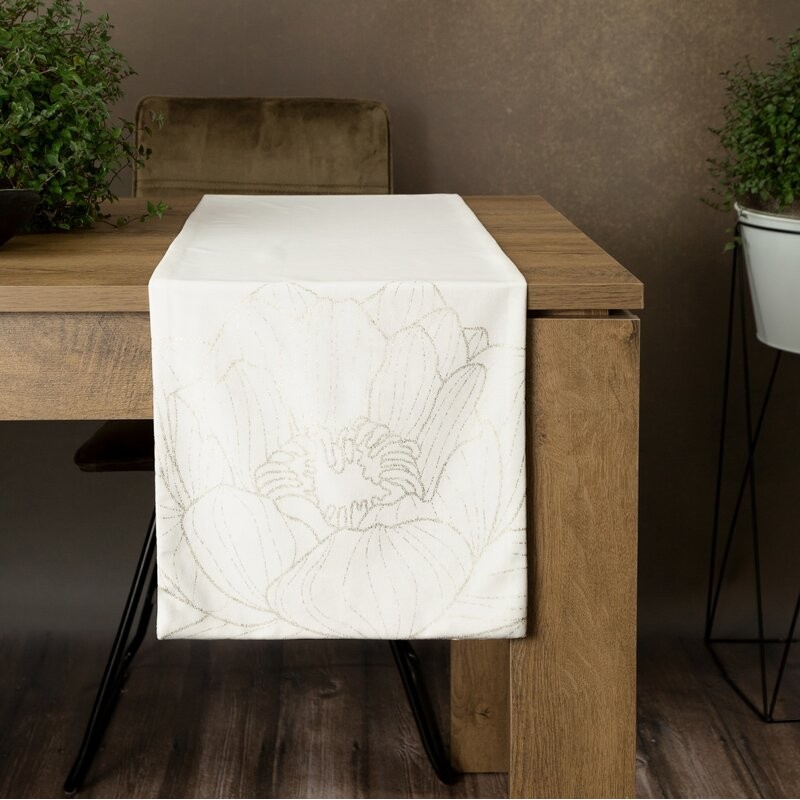 Kremowy bieżnik z delikatnym złotym połyskiem szerokość: 40 cm, długość: 140 cm, kolor: biały, Gramatura: 125 GSM, Skład: 94% poliester, 6% nić metaliczna