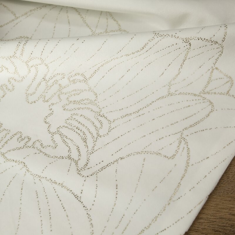 Kremowy bieżnik z delikatnym złotym połyskiem szerokość: 40 cm, długość: 180 cm, kolor: biały, Gramatura: 125 GSM, Skład: 94% poliester, 6% nić metaliczna