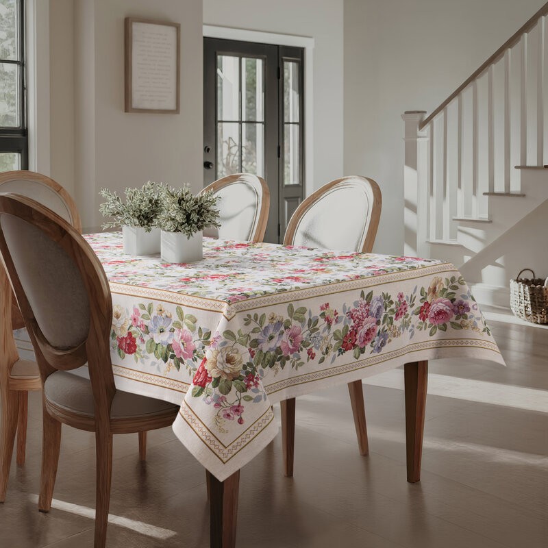 Dodaj uroku swojej jadalni lub salonowi dzięki eleganckiemu gobelinowemu obrusowi zdobionemu kwiatowym motywem. Wykonany z trwałej mieszanki włókien bawełniano-poliestrowych, obrus łączy naturalny wygląd z wytrzymałością i odpornością na codzienne użytkowanie. Kwiatowy wzór, pełen delikatnych detali, nadaje aranżacji stołu świeżości, subtelnego koloru i ponadczasowego wdzięku. Idealny zarówno na co dzień, jak i na specjalne okazje.