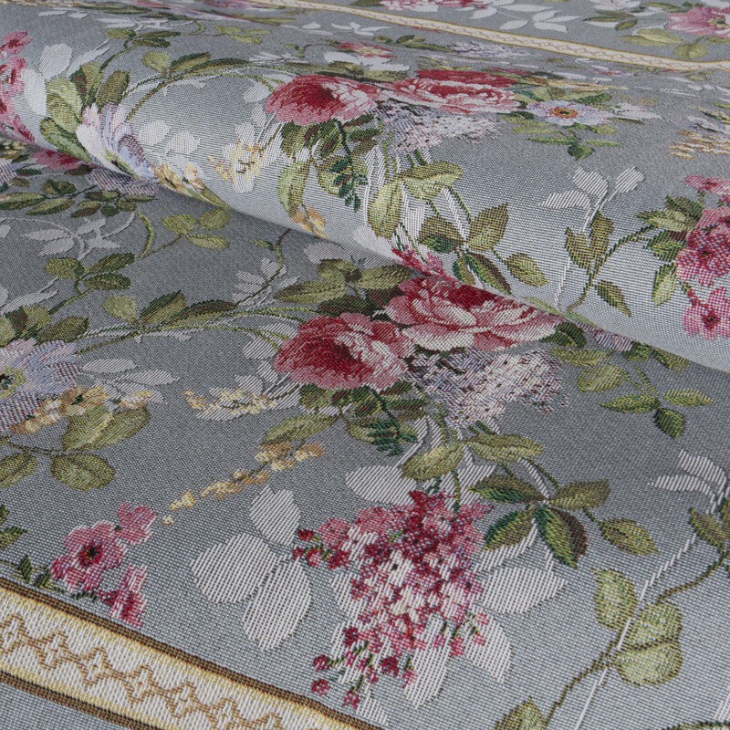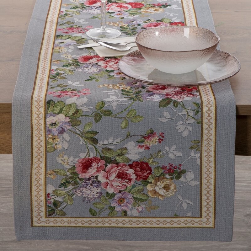 Obrus gobelinowy szerokość: 45 cm, długość: 140 cm, kolor: popielaty, Gramatura: 410 GSM, Skład: 63% poliester, 34% bawełna, 3% akryl