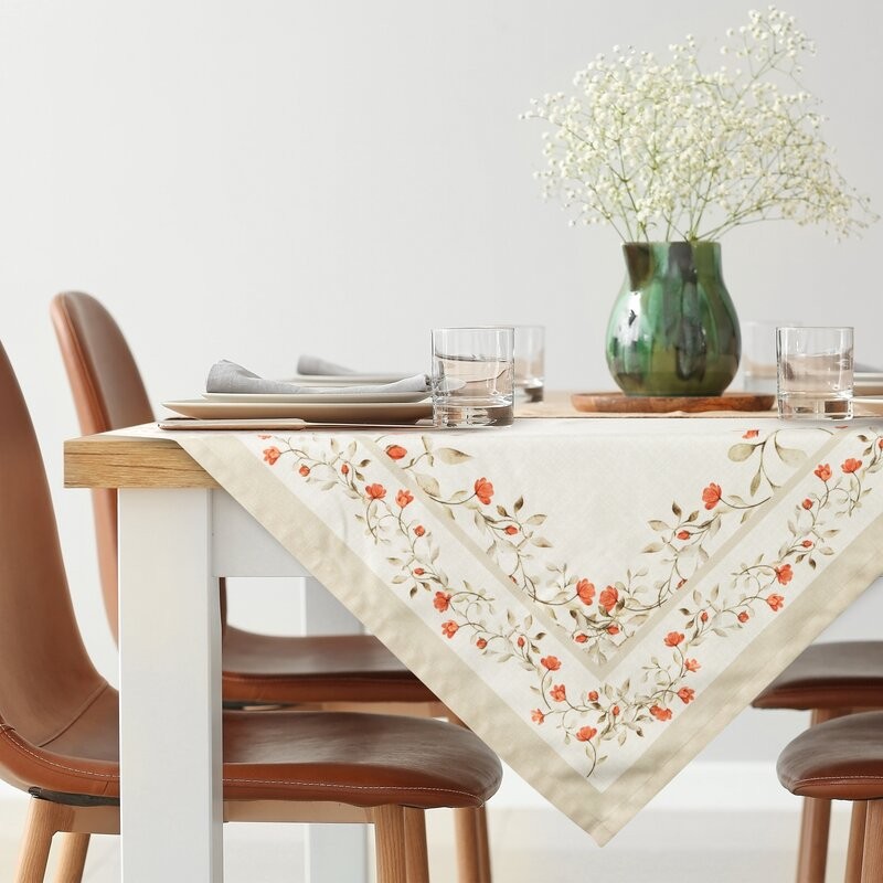 Obrus z nadrukowanym wzorem kolor: beżowy, Gramatura: 176 GSM, Skład: 40% poliester, 41% bawełna, 19% len