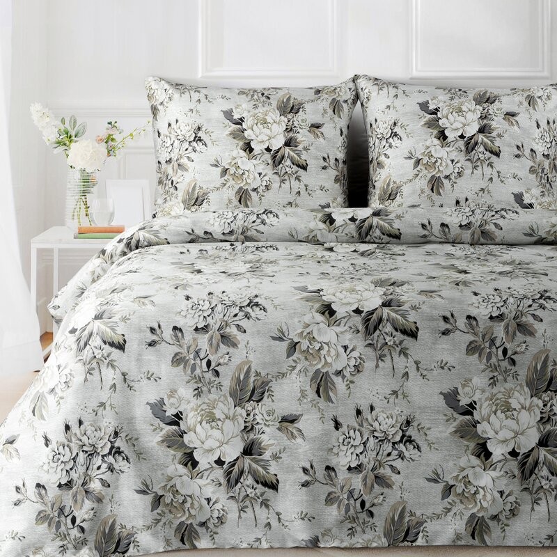 Pościel 160x200 cm z satyny bawełnianej kolor biało, stalowy z motywem kwiatów SPRING 67