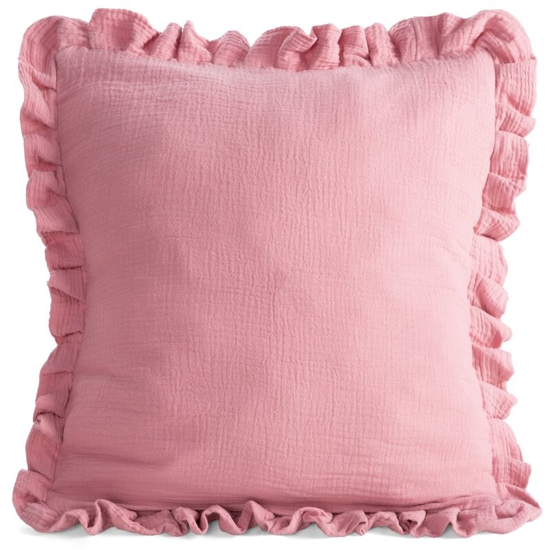 Muślinowa poszewka dekoracyjna obszyta ozdobną falbanką szerokość: 45 cm, długość: 45 cm, kolor: pudrowy, Gramatura: 120 GSM, Skład: 100% bawełna