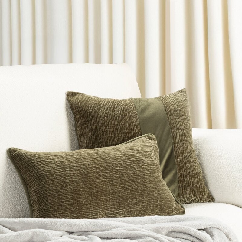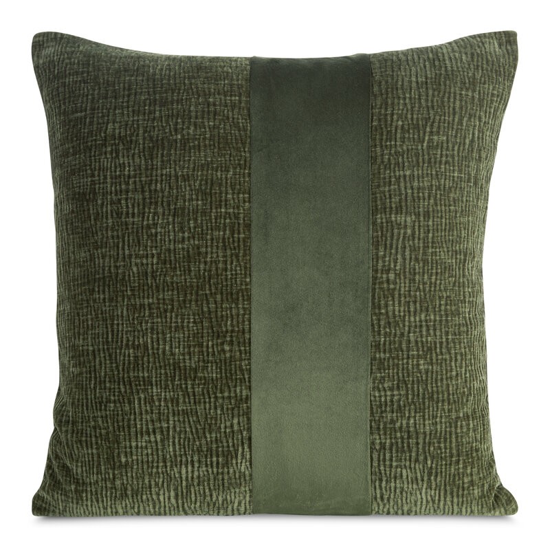 Nowoczesna poszewka dekoracyjna łącząca teksturę i kontrast materiałów. Wykonana z szenilowej tkaniny o garbowanej strukturze, ozdobiona pionowym pasem welwetu, który dodaje jej głębi i stylowego wykończenia. Gładki welwetowy tył zapewnia przyjemny dotyk, a praktyczny zamek błyskawiczny pozwala na łatwą wymianę poszewki. To idealny akcent, który podkreśli nowoczesny charakter Twojego wnętrza.