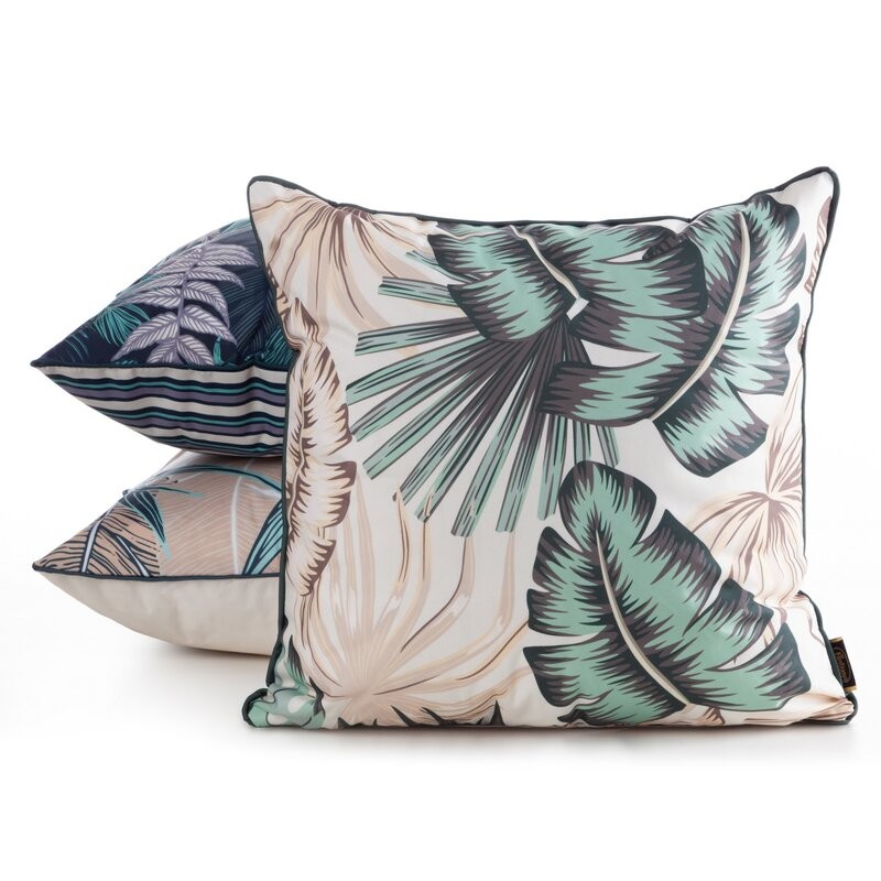Poszewka na poduszkę 45x45 cm z tkaniny wodoodpornej kremowo, zielona idealna na taras oraz balkon z motywem egzotycznych liści