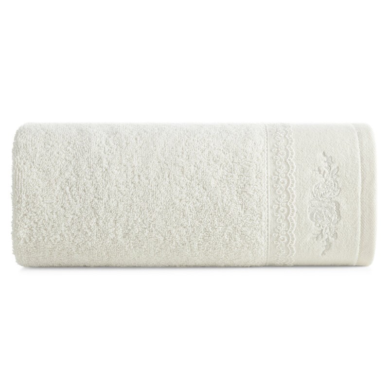 Piękny ręcznik kąpielowy z miękkiej i chłonnej bawełny frotte zdobiony na bordiurze aplikacją w formie serduszek wypełnionych różyczkami. Doskonały na prezent. szerokość: 50 cm, długość: 90 cm, kolor: kremowy, Gramatura: 500 GSM, Skład: 100% bawełna; część ozdobna: 100% poliester SZT.6