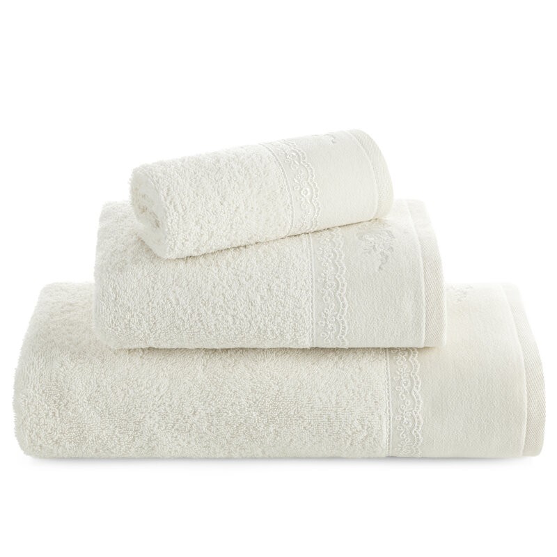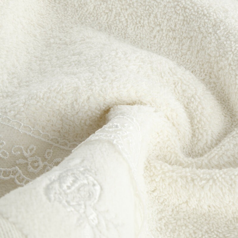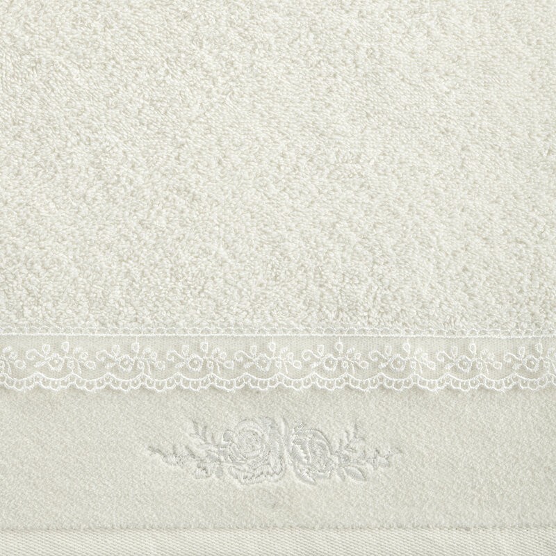 Piękny ręcznik kąpielowy z miękkiej i chłonnej bawełny frotte zdobiony na bordiurze aplikacją w formie serduszek wypełnionych różyczkami. Doskonały na prezent. szerokość: 70 cm, długość: 140 cm, kolor: kremowy, Gramatura: 500 GSM, Skład: 100% bawełna; część ozdobna: 100% poliester SZT.3