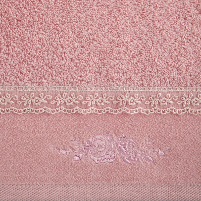 Ręcznik zdobi subtelna bordiura z delikatną koronką oraz starannie wykonany haft, który dodaje całości wyrafinowanego charakteru. To idealne połączenie funkcjonalności i stylu, które sprawdzi się zarówno w nowoczesnych, jak i klasycznych wnętrzach łazienkowych.