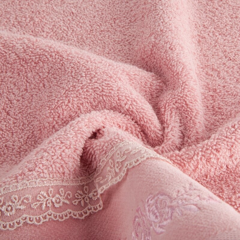 Piękny ręcznik kąpielowy z miękkiej i chłonnej bawełny frotte zdobiony na bordiurze aplikacją w formie serduszek wypełnionych różyczkami. Doskonały na prezent. szerokość: 50 cm, długość: 90 cm, kolor: różowy, Gramatura: 500 GSM, Skład: 100% bawełna; część ozdobna: 100% poliester SZT.6