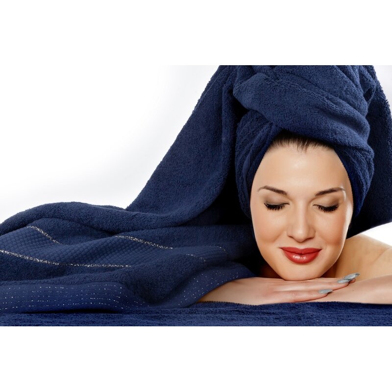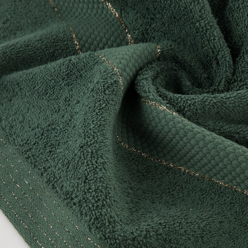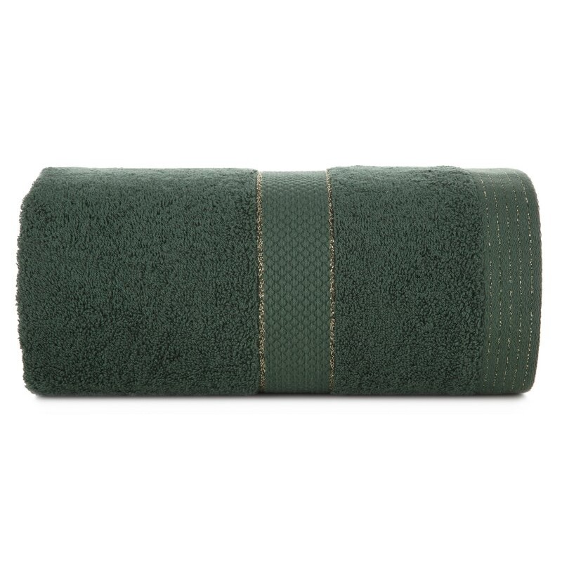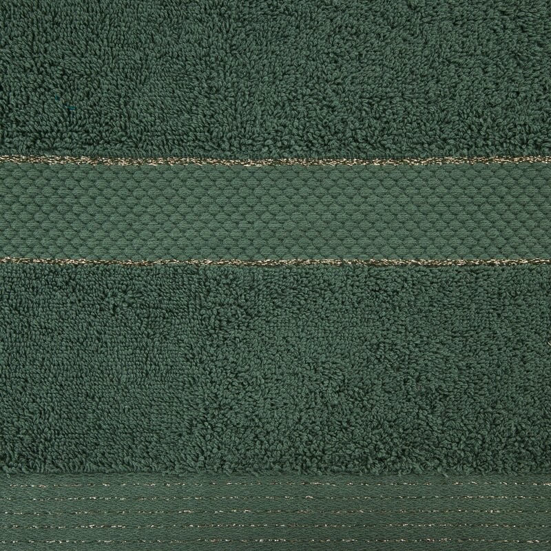 Miękki ręcznik bawełniany frotte o wysokich właściwościach chłonnych dokładnie i delikatnie osusza po kąpieli. Bordiura z dodatkiem metalicznej nici lekko lśni. szerokość: 50 cm, długość: 90 cm, kolor: zielony, Gramatura: 500 GSM, Skład: 100% bawełna; część ozdobna: 95% bawełna, 5% poliester SZT.6