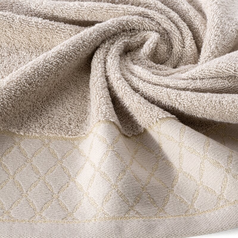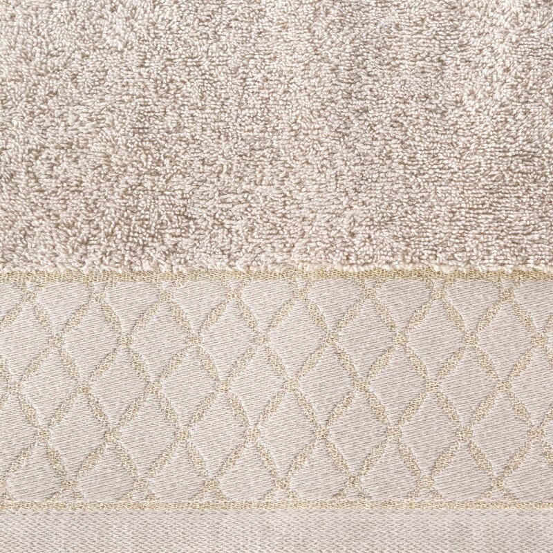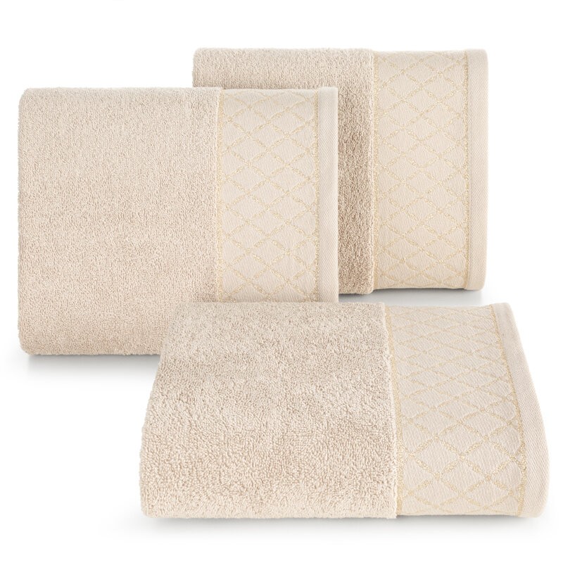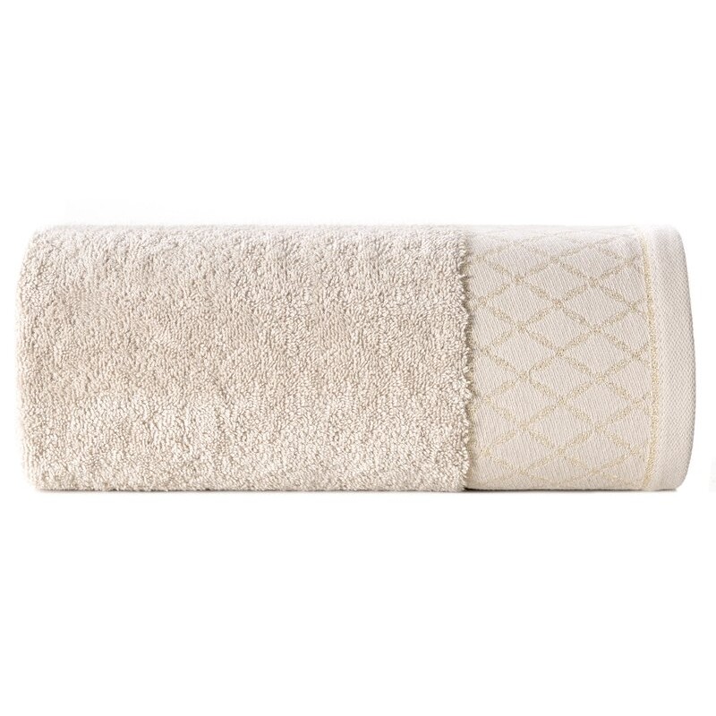 Jednobarwny ręcznik z miękkiej i chłonnej tkaniny bawełnianej o splocie frotte zdobiony kolorową bordiurą w stylu fastrygi. Łatwy w praniu, nie farbuje. szerokość: 50 cm, długość: 90 cm, kolor: kremowy, Gramatura: 500 GSM, Skład: 100% bawełna;...