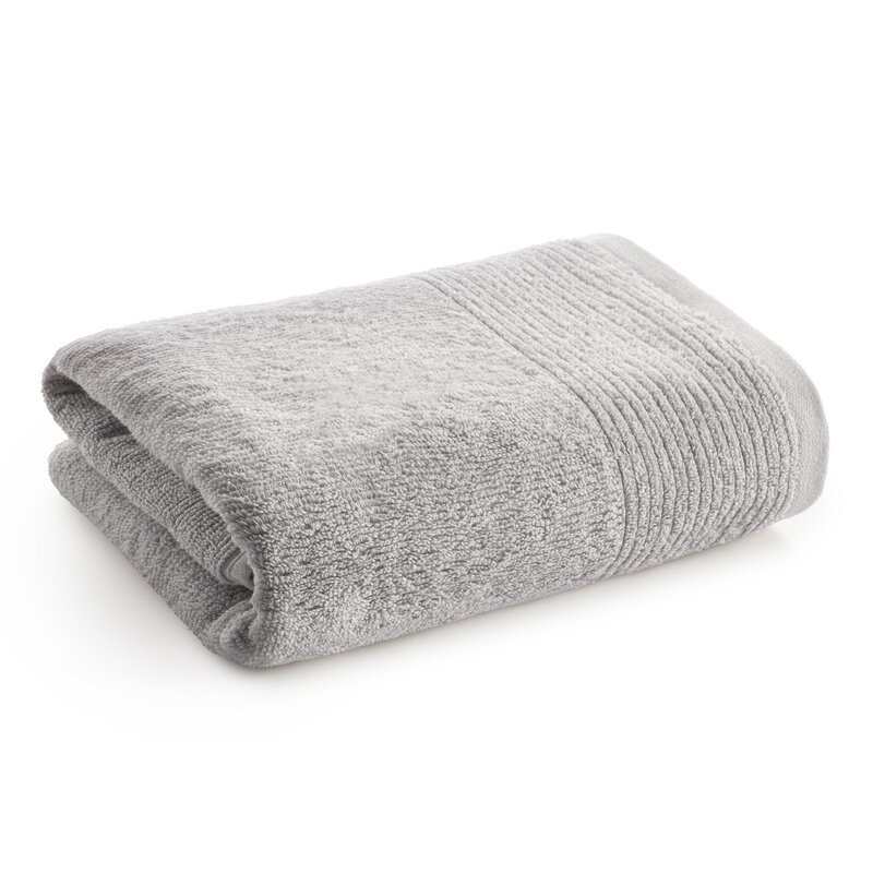 Jednobarwny ręcznik z miękkiej i chłonnej tkaniny bawełnianej o splocie frotte zdobiony kolorową bordiurą w stylu fastrygi. Łatwy w praniu, nie farbuje. szerokość: 70 cm, długość: 140 cm, kolor: stalowy, Gramatura: 500 GSM, Skład: 100% bawełna;...