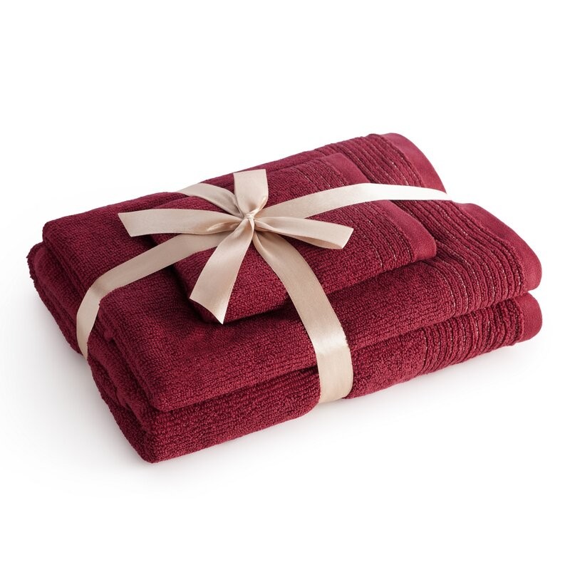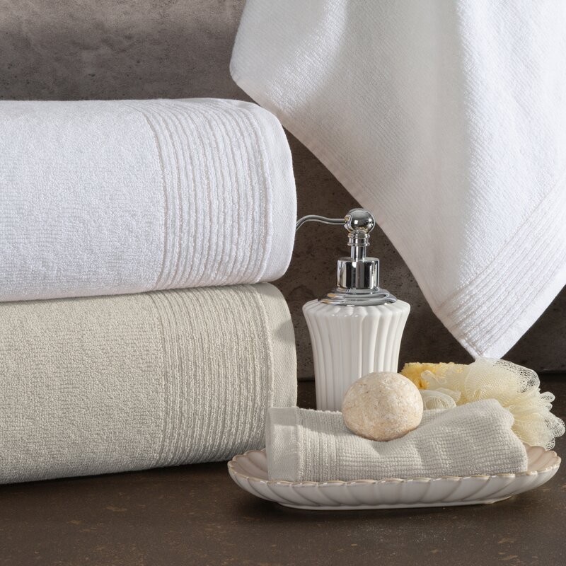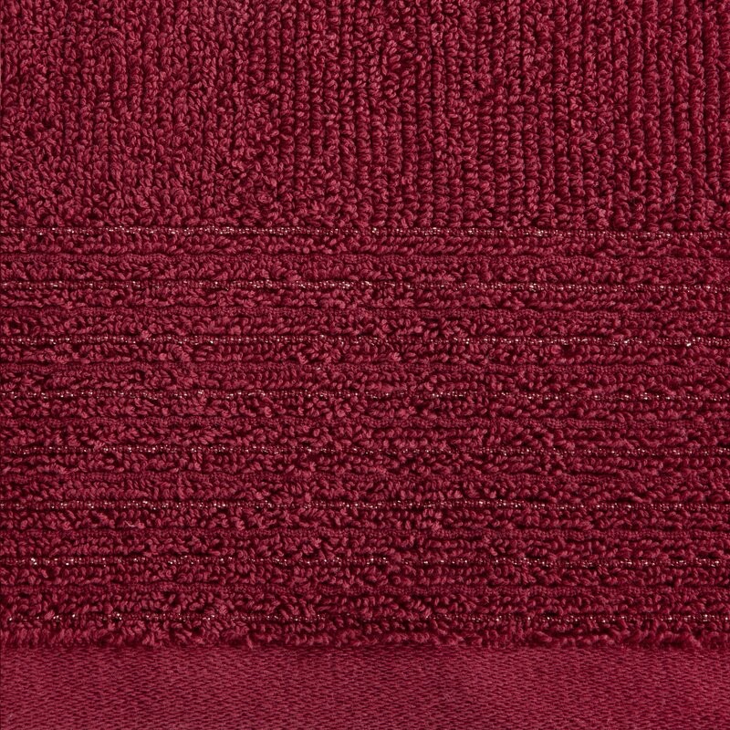 Elegancki ręcznik bawełniany o gramaturze 500 g/m², łączący wysoką jakość i wyrafinowany design. Wykonany z miękkiej, puszystej bawełny, zapewnia doskonałą chłonność oraz przyjemność użytkowania, a jego gramatura sprawia, że jest zarówno lekki, jak i wytrzymały. Materiał jest miły w dotyku, a jednocześnie szybkoschnący, co czyni go idealnym wyborem do codziennego użytku. Ozdobą ręcznika jest elegancka bordiura, na której znajdują się subtelne, poziome paseczki. Paseczki te są przetykane delikatną, błyszczącą nicią, co dodaje całości lekkości i blasku. Dzięki temu ręcznik nabiera luksusowego charakteru, a jego elegancki wygląd świetnie wpisuje się zarówno w nowoczesne, jak i klasyczne wnętrza łazienek. Błyszcząca nić w bordiurze tworzy subtelne refleksy, które delikatnie odbijają światło, dodając ręcznikowi wyrafinowanego uroku. Idealny jako ozdoba łazienki oraz praktyczny element codziennego wyposażenia, który łączy funkcjonalność z estetyką.