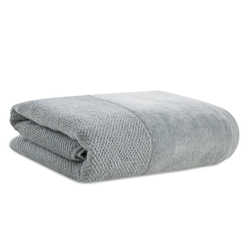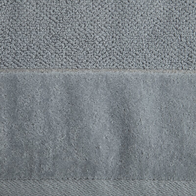 Jednobarwny ręcznik z miękkiej i chłonnej tkaniny bawełnianej o splocie frotte zdobiony kolorową bordiurą w stylu fastrygi. Łatwy w praniu, nie farbuje. szerokość: 50 cm, długość: 90 cm, kolor: stalowy, Gramatura: 500 GSM, Skład: 100% bawełna;...