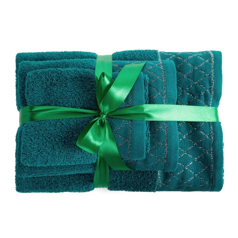 Jednobarwny ręcznik z miękkiej i chłonnej tkaniny bawełnianej o splocie frotte zdobiony kolorową bordiurą w stylu fastrygi. Łatwy w praniu, nie farbuje. szerokość: 70 cm, długość: 140 cm, kolor: ciemnozielony, Gramatura: 500 GSM, Skład: 100%...