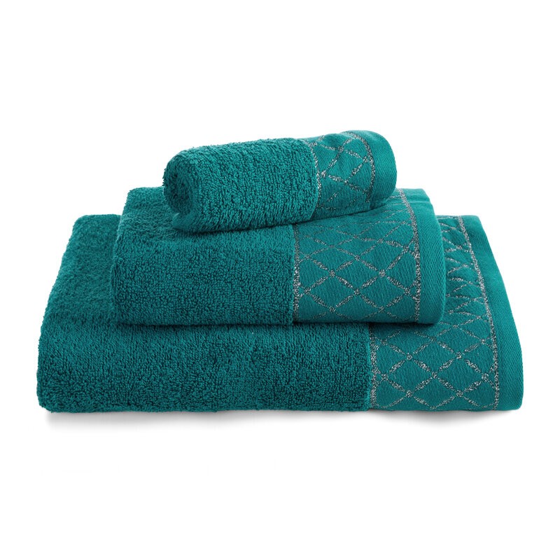 Jednobarwny ręcznik z miękkiej i chłonnej tkaniny bawełnianej o splocie frotte zdobiony kolorową bordiurą w stylu fastrygi. Łatwy w praniu, nie farbuje. szerokość: 30 cm, długość: 50 cm, kolor: ciemnoturkusowy, Gramatura: 500 GSM, Skład: 100%...