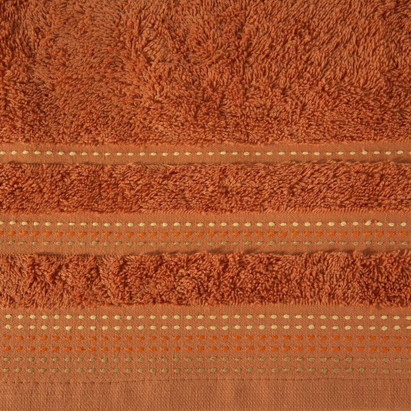 Jednobarwny ręcznik z miękkiej i chłonnej tkaniny bawełnianej o splocie frotte zdobiony kolorową bordiurą w stylu fastrygi. Łatwy w praniu, nie farbuje. szerokość: 70 cm, długość: 140 cm, kolor: pomarańczowy, Gramatura: 500 GSM, Skład: 100%...