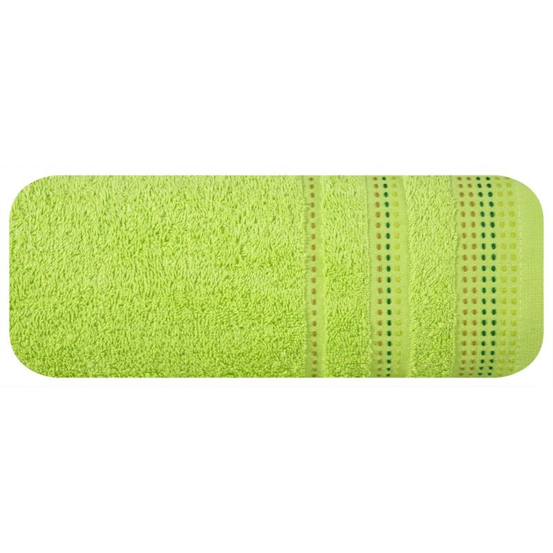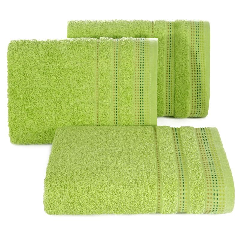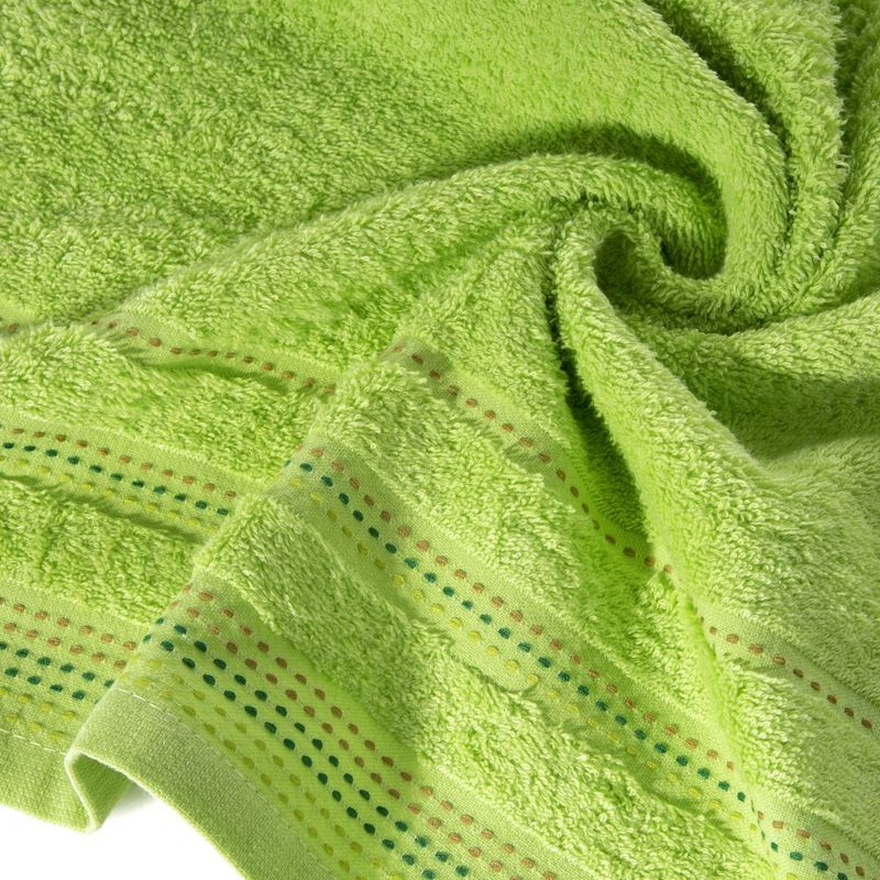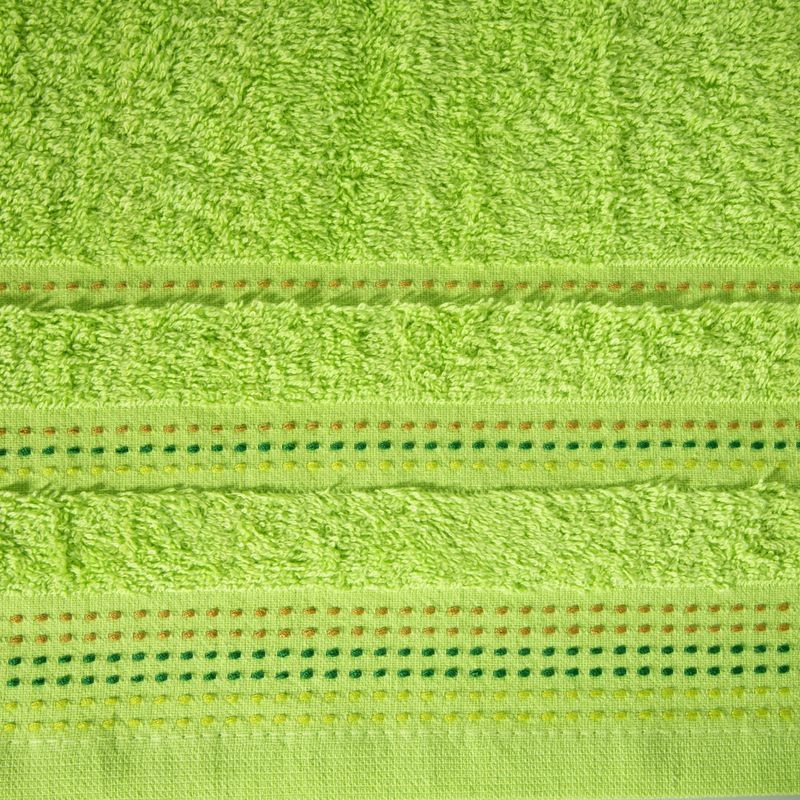 Jednobarwny ręcznik z miękkiej i chłonnej tkaniny bawełnianej o splocie frotte zdobiony kolorową bordiurą w stylu fastrygi. Łatwy w praniu, nie farbuje. szerokość: 50 cm, długość: 90 cm, kolor: zielony, Gramatura: 500 GSM, Skład: 100% bawełna SZT.6