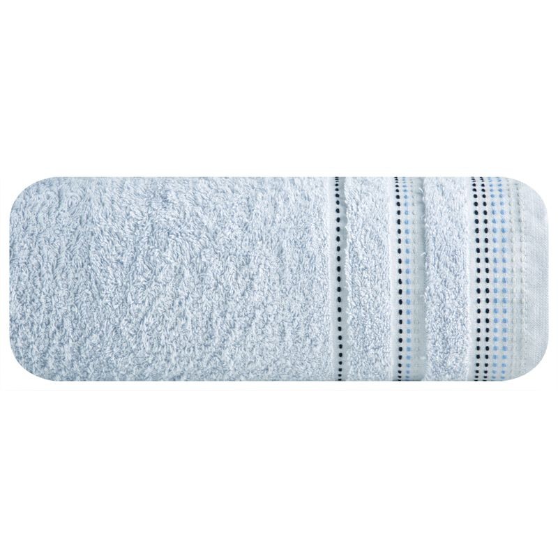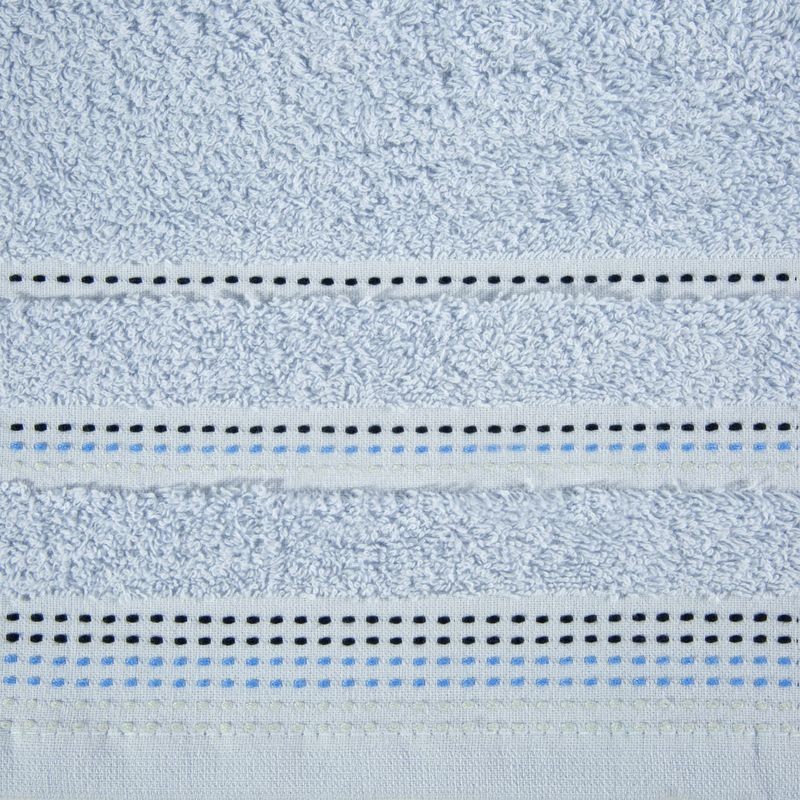Jednobarwny ręcznik z miękkiej i chłonnej tkaniny bawełnianej o splocie frotte zdobiony kolorową bordiurą w stylu fastrygi. Łatwy w praniu, nie farbuje. szerokość: 70 cm, długość: 140 cm, kolor: niebieski, Gramatura: 500 GSM, Skład: 100% bawełna