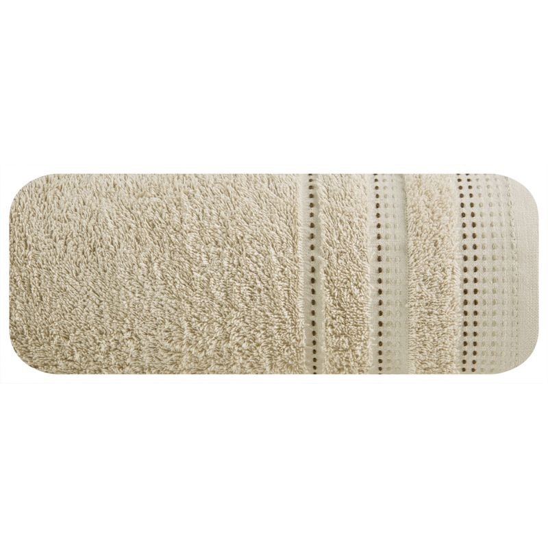 Jednobarwny ręcznik z miękkiej i chłonnej tkaniny bawełnianej o splocie frotte zdobiony kolorową bordiurą w stylu fastrygi. Łatwy w praniu, nie farbuje. szerokość: 50 cm, długość: 90 cm, kolor: beżowy, Gramatura: 550 GSM, Skład: 75% bawełna, 25%...