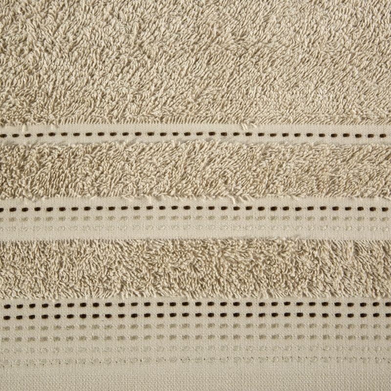 Jednobarwny ręcznik z miękkiej i chłonnej tkaniny bawełnianej o splocie frotte zdobiony kolorową bordiurą w stylu fastrygi. Łatwy w praniu, nie farbuje. szerokość: 30 cm, długość: 50 cm, kolor: beżowy, Gramatura: 500 GSM, Skład: 100% bawełna SZT.6