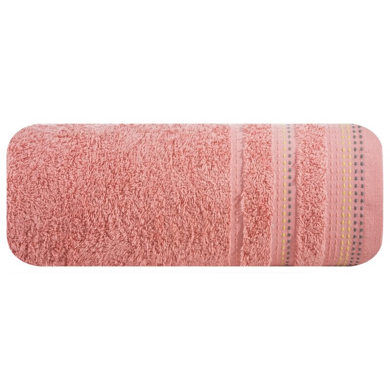 Jednobarwny ręcznik z miękkiej i chłonnej tkaniny bawełnianej o splocie frotte zdobiony kolorową bordiurą w stylu fastrygi. Łatwy w praniu, nie farbuje. szerokość: 30 cm, długość: 50 cm, kolor: koralowy, Gramatura: 500 GSM, Skład: 100% bawełna SZT.6
