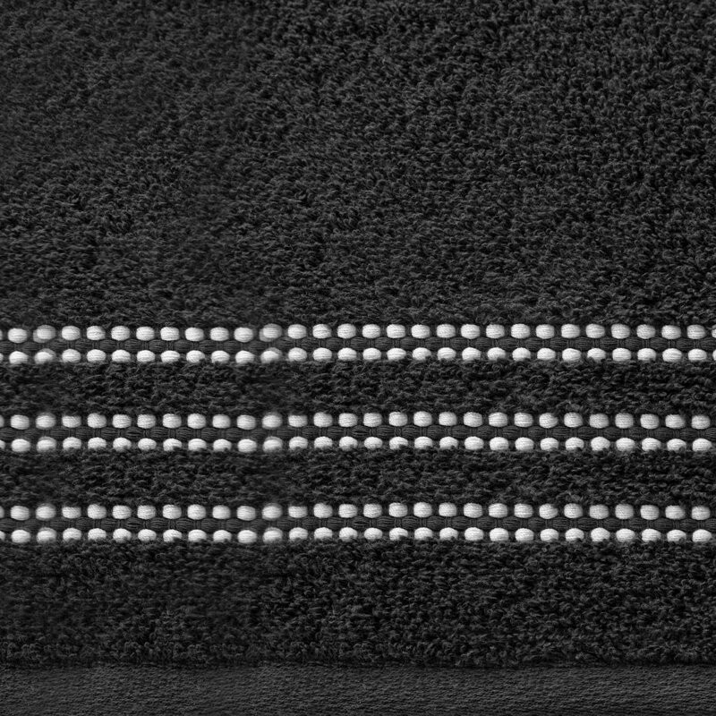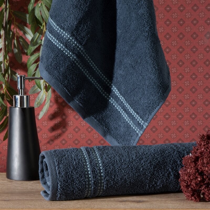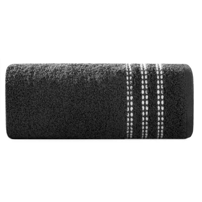 Puszysty i chłonny ręcznik kąpielowy z bawełny frotte o klasycznym charakterze zdobiony elegancką bordiurą w paski z dodatkiem lśniących nici. Łatwy w praniu. szerokość: 70 cm, długość: 140 cm, kolor: stalowy, Gramatura: 400 GSM, Skład: 100%...