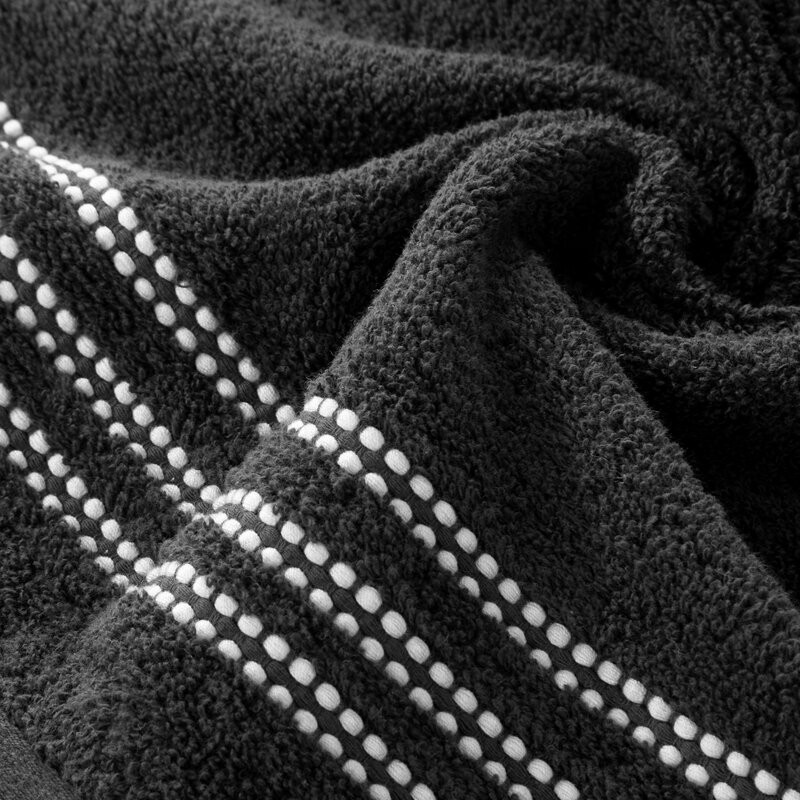 Jednobarwny ręcznik z miękkiej i chłonnej tkaniny bawełnianej o splocie frotte zdobiony kolorową bordiurą w stylu fastrygi. Łatwy w praniu, nie farbuje. szerokość: 100 cm, długość: 150 cm, kolor: srebrny, Gramatura: 500 GSM, Skład: 100% bawełna