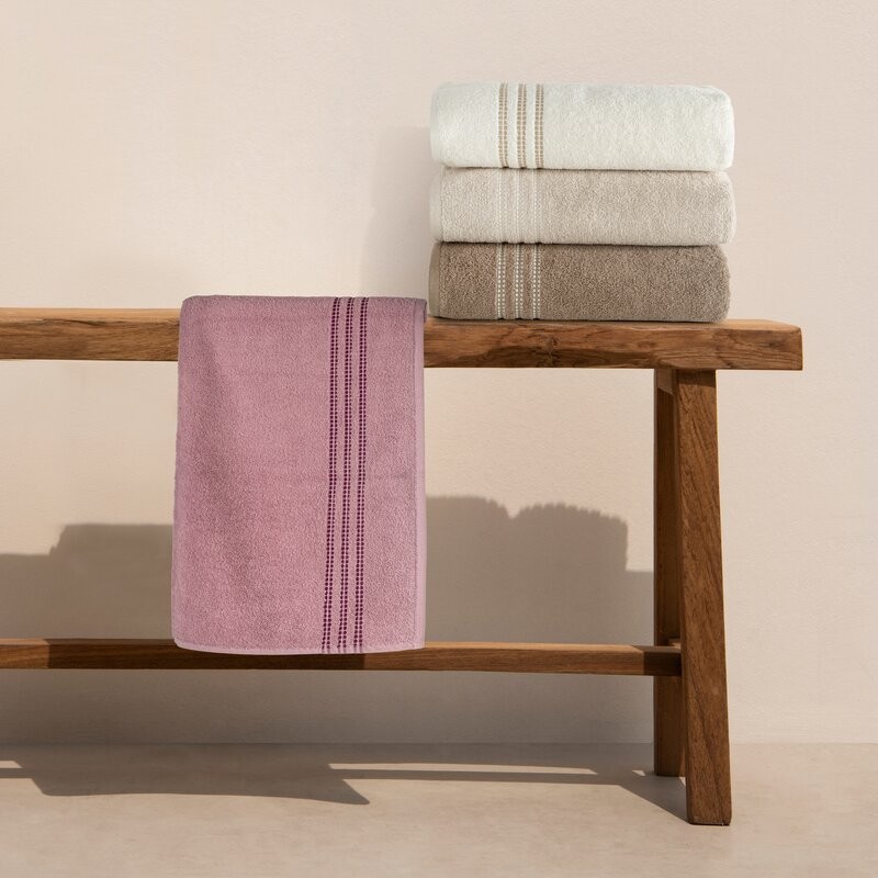 Puszysty i chłonny ręcznik kąpielowy z bawełny frotte o klasycznym charakterze zdobiony elegancką bordiurą w paski z dodatkiem lśniących nici. Łatwy w praniu. szerokość: 50 cm, długość: 90 cm, kolor: beżowy, Gramatura: 400 GSM, Skład: 100%...