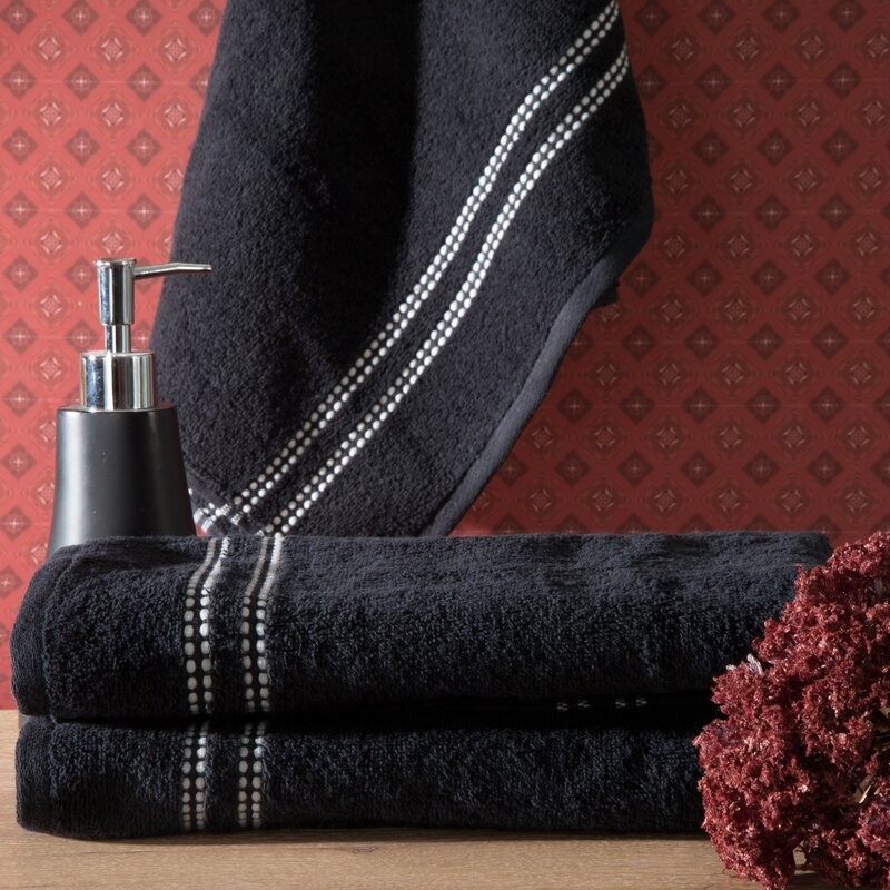 Jednobarwny ręcznik z miękkiej i chłonnej tkaniny bawełnianej o splocie frotte zdobiony kolorową bordiurą w stylu fastrygi. Łatwy w praniu, nie farbuje. szerokość: 100 cm, długość: 150 cm, kolor: bordowy, Gramatura: 500 GSM, Skład: 100% bawełna;...
