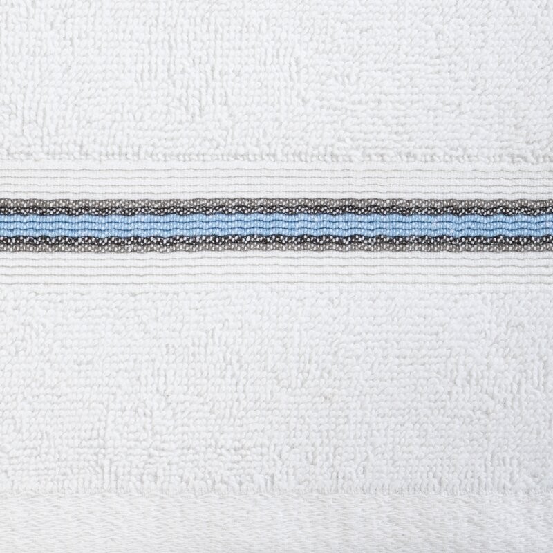 Ręcznik wyróżnia się estetyczną, tkaną bordiurą w kontrastujące pasy, która nadaje mu nowoczesny, elegancki charakter i sprawia, że będzie stylowym dodatkiem do każdej łazienki.