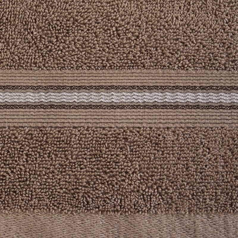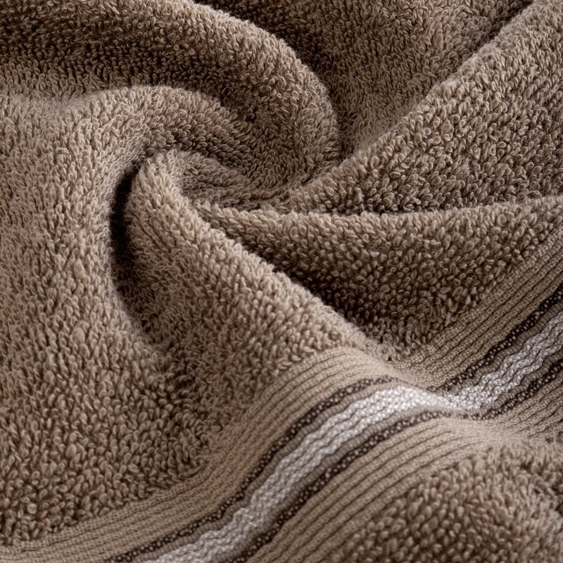 Ręcznik wyróżnia się estetyczną, tkaną bordiurą w kontrastujące pasy, która nadaje mu nowoczesny, elegancki charakter i sprawia, że będzie stylowym dodatkiem do każdej łazienki.