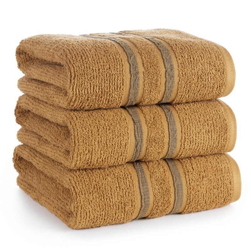 Ręcznik welurowy z prostą bordiurą i frotte ze strukturą szerokość: 70 cm, długość: 140 cm, kolor: musztardowy, Gramatura: 500 GSM, Skład: 100% bawełna; część ozdobna: 50% poliester, 50% bawełna SZT.3