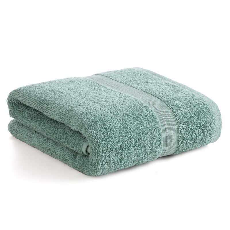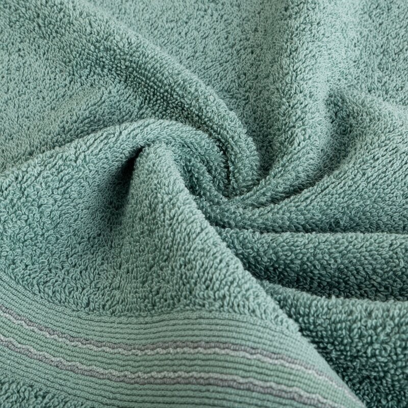 Jednobarwny ręcznik z miękkiej i chłonnej tkaniny bawełnianej o splocie frotte zdobiony kolorową bordiurą w stylu fastrygi. Łatwy w praniu, nie farbuje. szerokość: 100 cm, długość: 150 cm, kolor: miętowy, Gramatura: 500 GSM, Skład: 100% bawełna