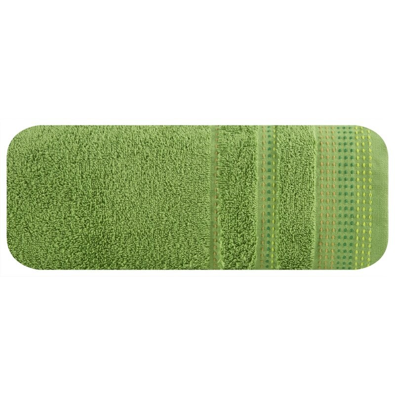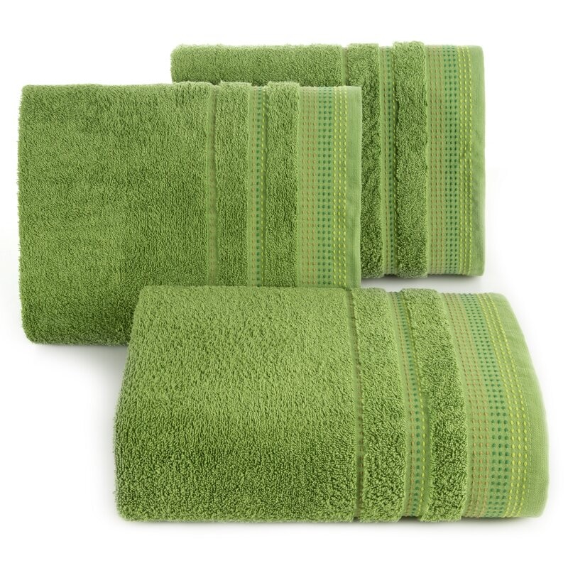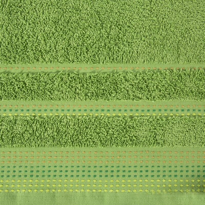 Jednobarwny ręcznik z miękkiej i chłonnej tkaniny bawełnianej o splocie frotte zdobiony kolorową bordiurą w stylu fastrygi. Łatwy w praniu, nie farbuje. szerokość: 30 cm, długość: 50 cm, kolor: zielony, Gramatura: 500 GSM, Skład: 100% bawełna SZT.6