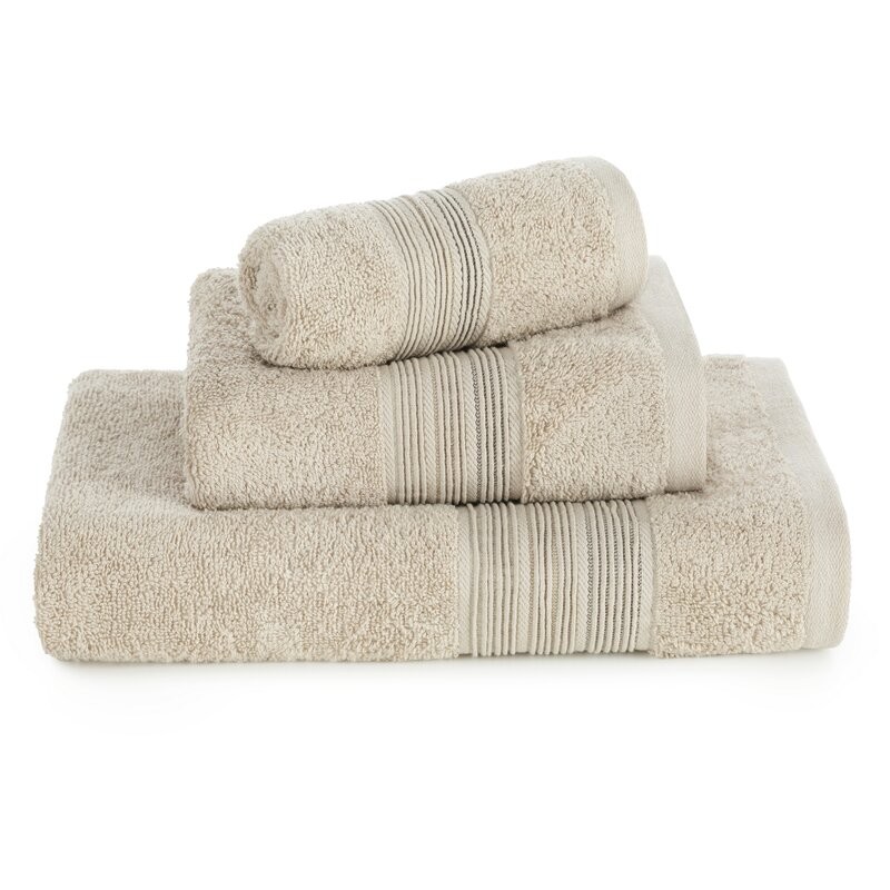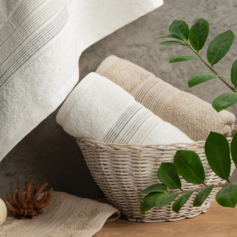 Jednobarwny ręcznik z miękkiej i chłonnej tkaniny bawełnianej o splocie frotte zdobiony kolorową bordiurą w stylu fastrygi. Łatwy w praniu, nie farbuje. szerokość: 30 cm, długość: 50 cm, kolor: kremowy, Gramatura: 500 GSM, Skład: 100% bawełna SZT.6